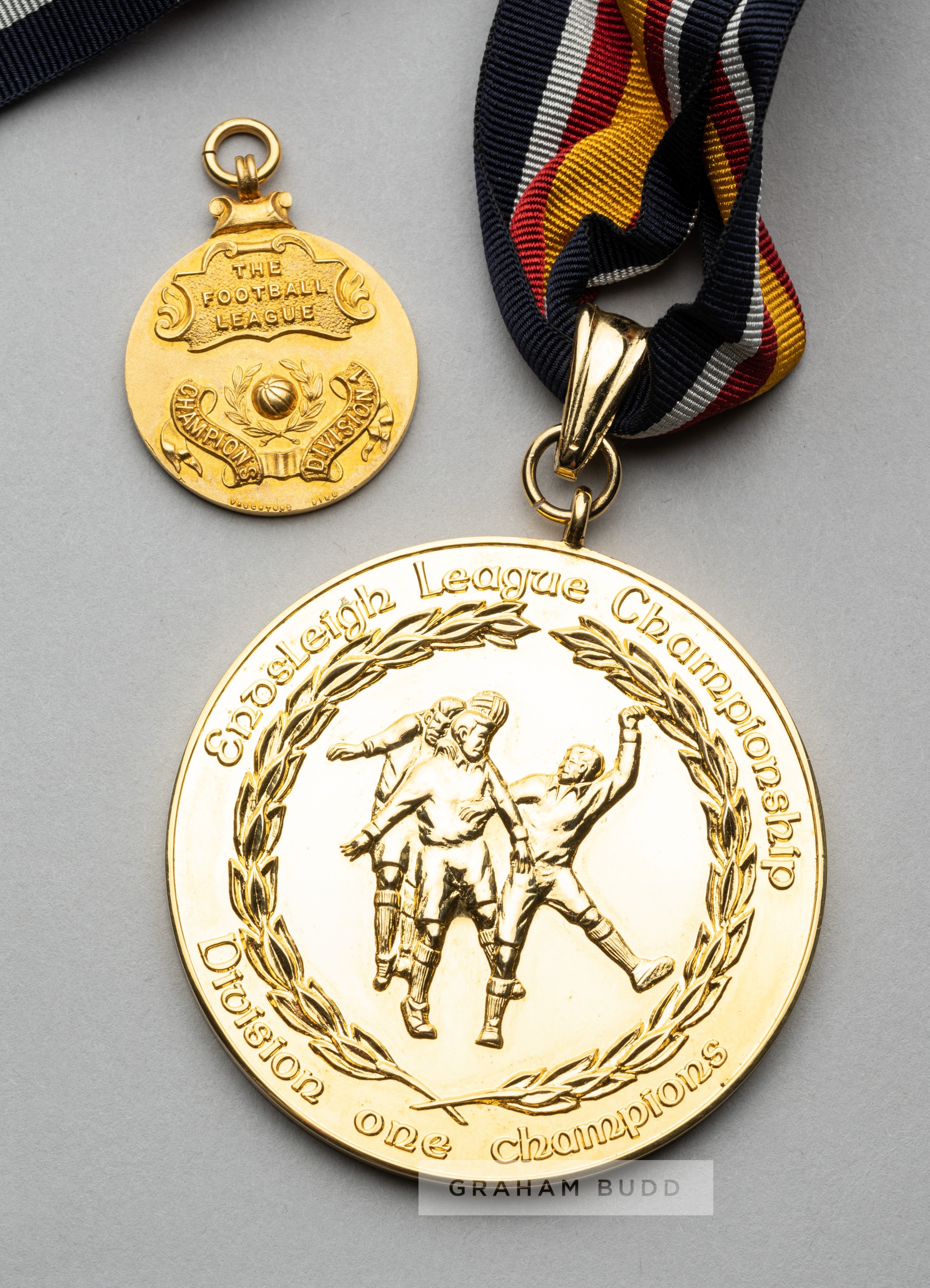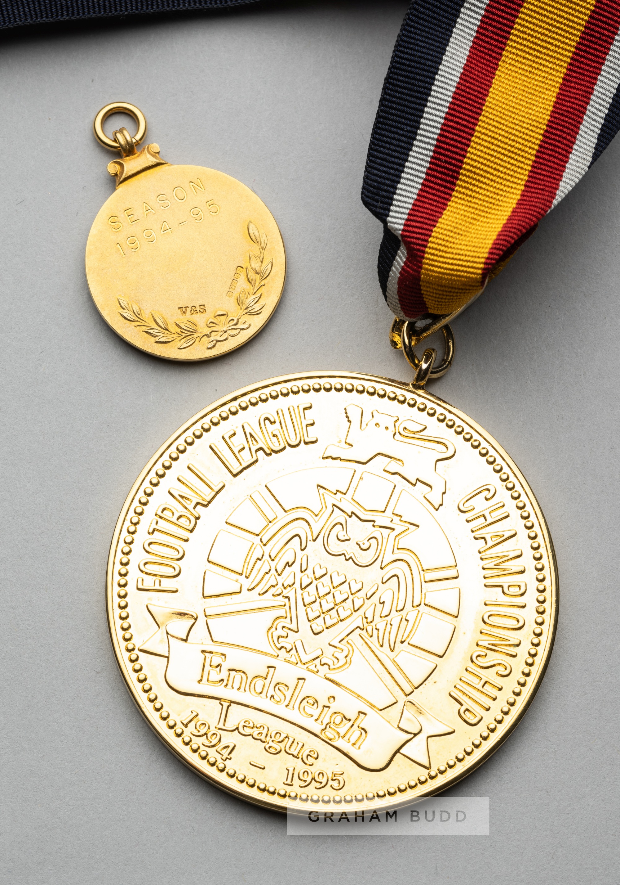 Football League Division One Championship medal awarded to Middlesbrough's Clayton Blackmore in season 1994-95, obverse with THE FOOTBALL LEAGUE CHAMPIONS DIVISION 1 surrounding a football in relief, reverse engraved SEASON 1994-95, circular with suspension ring, hallmarked 9ct gold Birmingham 1995 by Vaughton & Sons, weight 14gms., diameter 27mm., in gilt tooled case THE FOOTBALL LEAGUE with logo, sold with a gilt metal Endsleigh League Champions Division One Champions sponsor's medal with ribbon, obverse with footballers in relief and ENDSLEIGH LEAGUE CHAMPIONS DIVISION ONE CHAMPIONS, reverse with FOOTBALL LEAGUE CHAMPIONS ENDSLEIGH LEAGUE 1994-1995, diameter 63mm., with amber, red and black striped ribbon, (2) Clayton Blackmore played for Middlesbrough during 1994-99, making 53 appearances scoring four goals. Provenance: Clayton Blackmore collection Sotheby's auction Lot 197 14th July 2002.