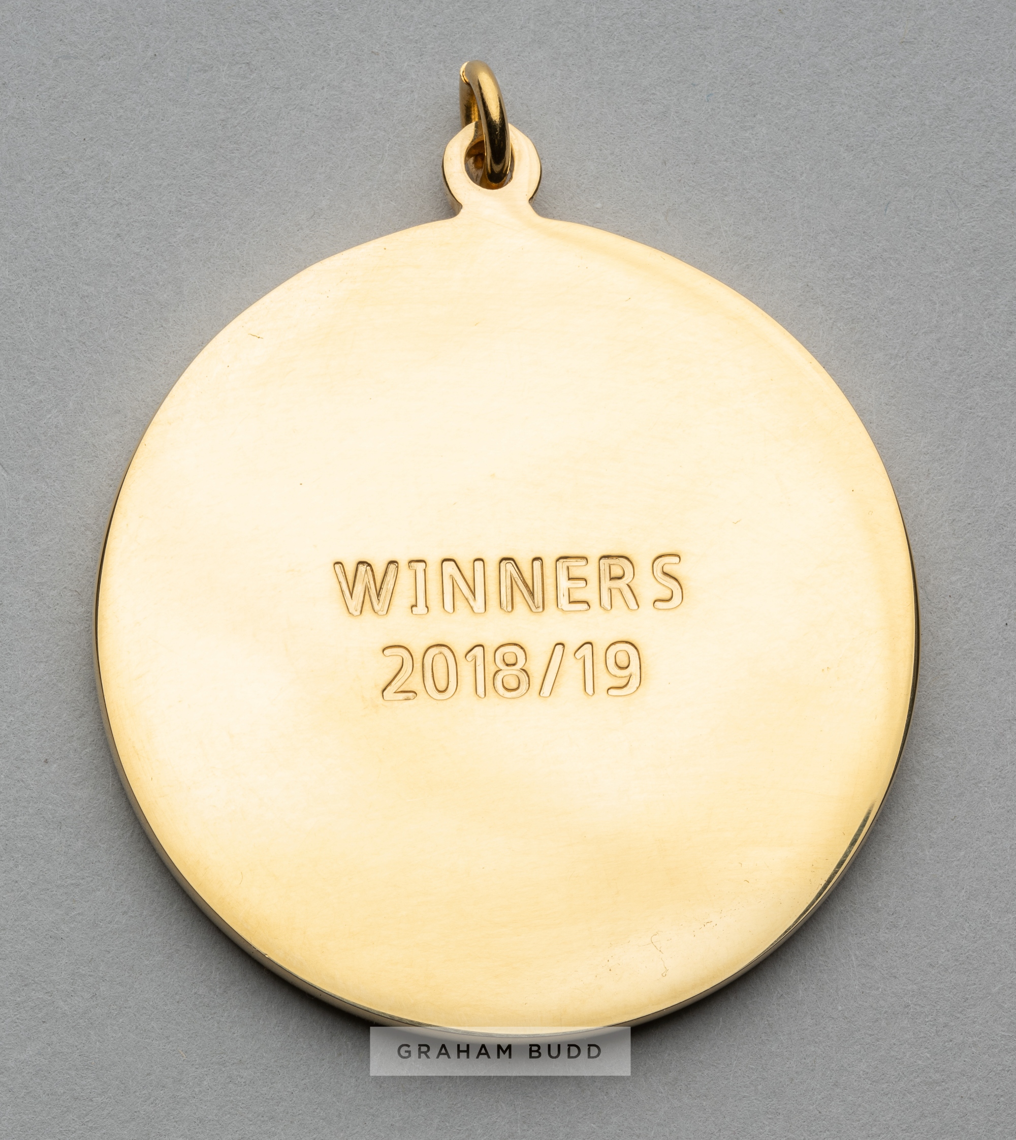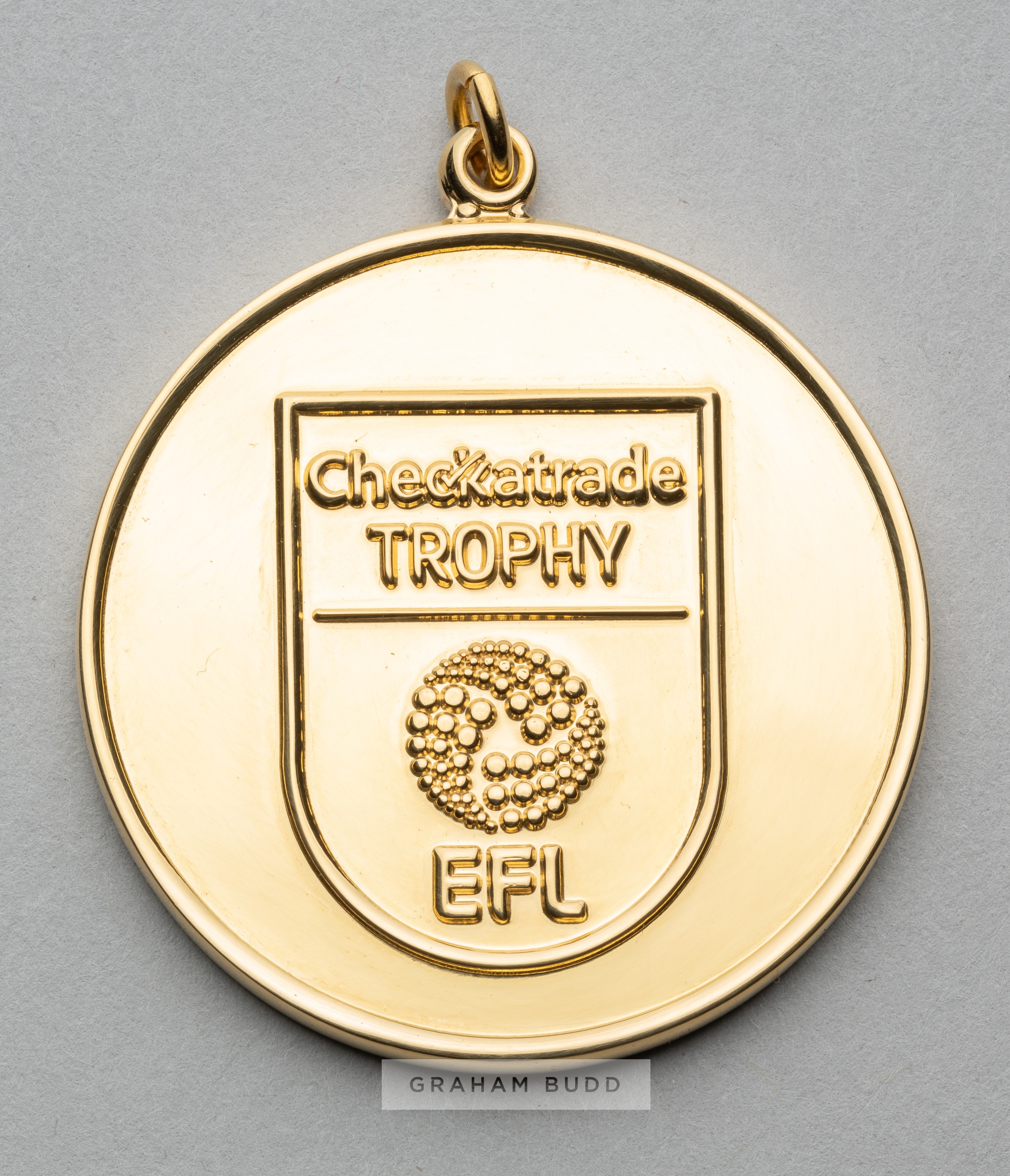 Portsmouth FC EFL Checkatrade Trophy 2018-19 winner's medal gilt metal medal, obverse with a shield in relief and CHECKATRADE TROPHY EFL, reverse en