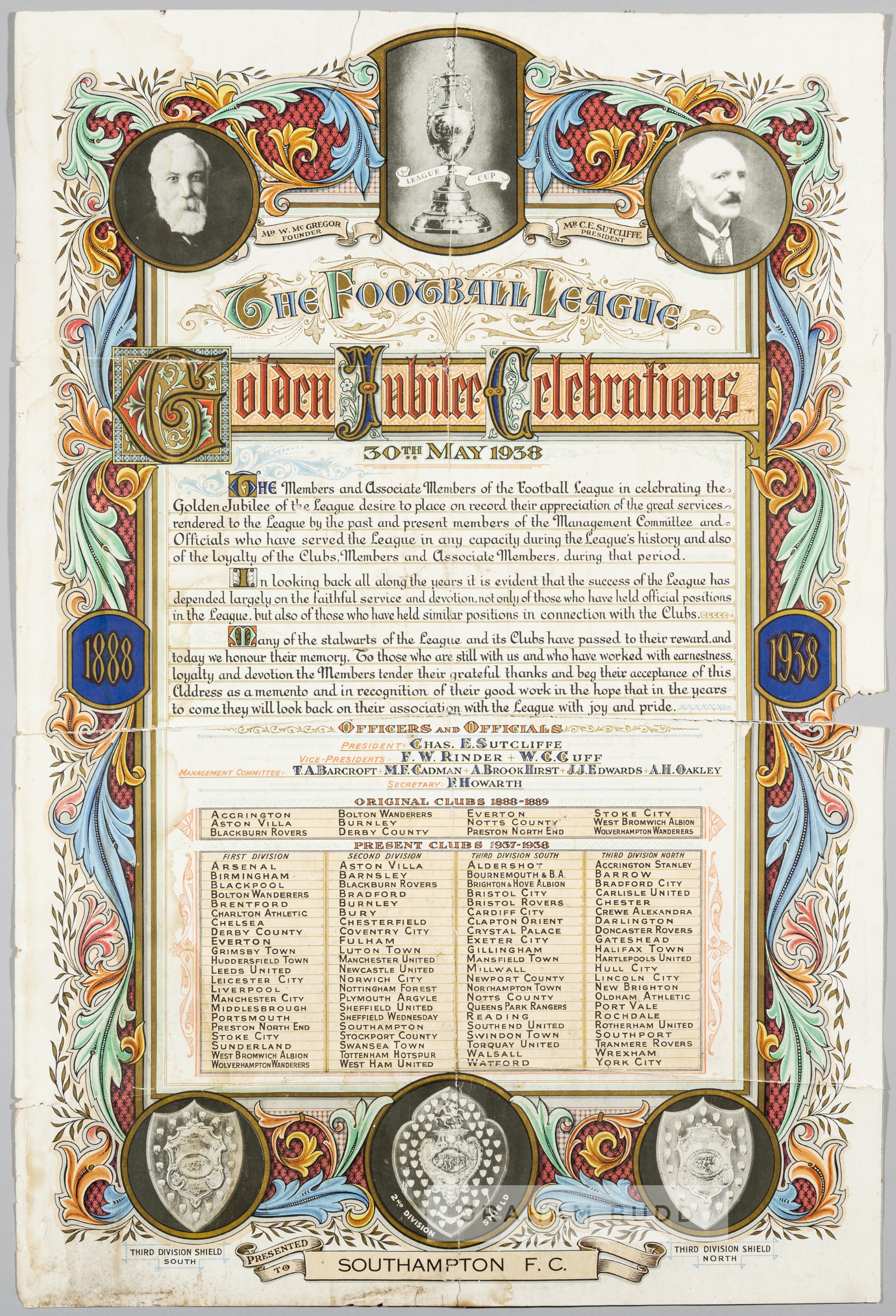 Official Football League celebratory Golden Jubilee (1888-1938) illuminated address presented to Southampton FC 30th May 1938, 30 by 20 in., colour illustrated address with editorial, list of founder clubs and current clubs for 1937-38 season, featuring profile of Mr W McGregor and Mr CE Sutcliffe with images of the trophy plaques for third division shield south, 2nd division shield and third division shield north, in two halves but with some losses, fold lines and tears, foxing, could be professionally repaired