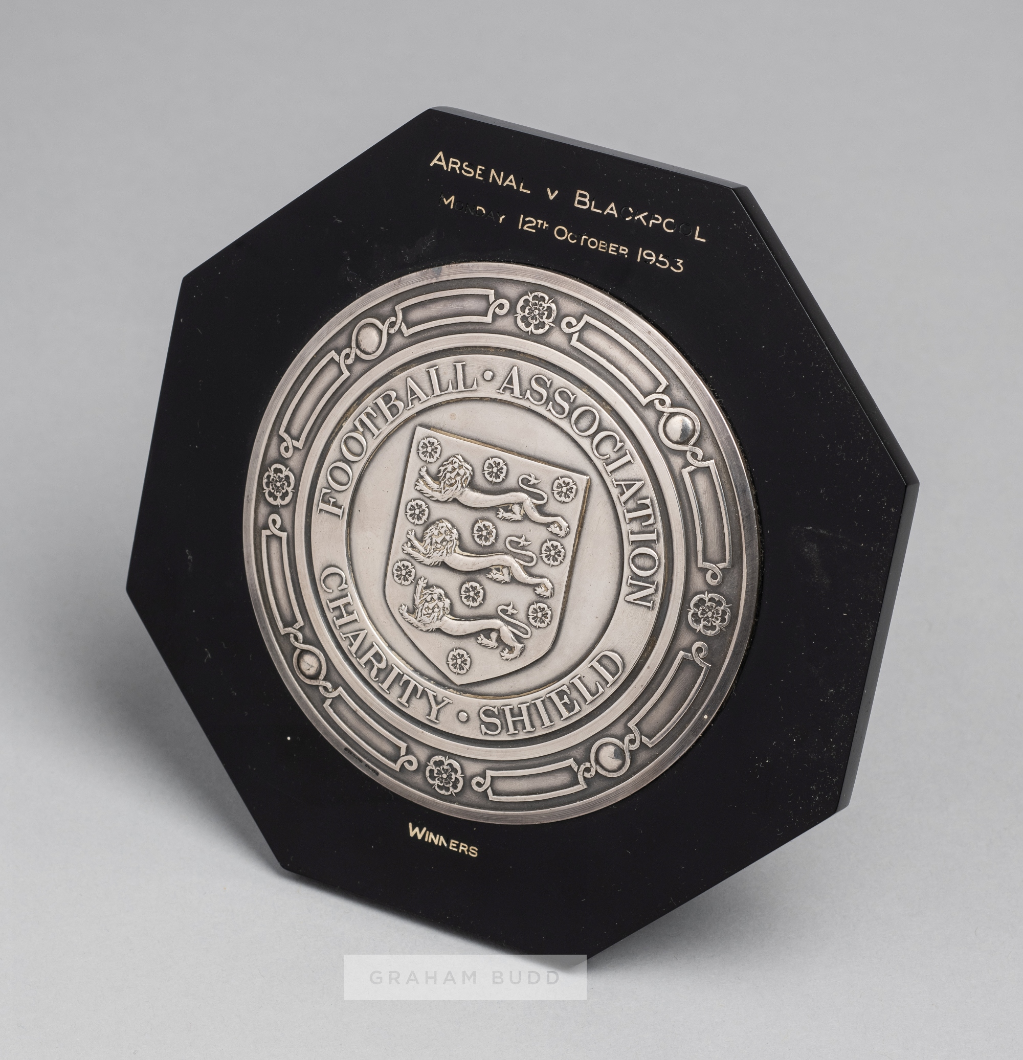 F.A. Charity Shield winner's plaque awarded to Arsenal's Jimmy Logie v Blackpool, played at Highbury, 12th August 1953, sterling silver roundel with FOOTBALL ASSOCIATION CHAARITY SHIELD and three lion emblem, mounted on a octagonal black bakelite plaque with gilt lettering ARSENAL V BLACKPOOL MARCH MONDAY 12TH OCTOBER 1953 WINNERS, roundel stamped STERLING SILVER, 13.5 by 13.5cm. Arsenal defeated Blackpool 3-1. Jimmy Logie played with Arsenal during 1935-55.