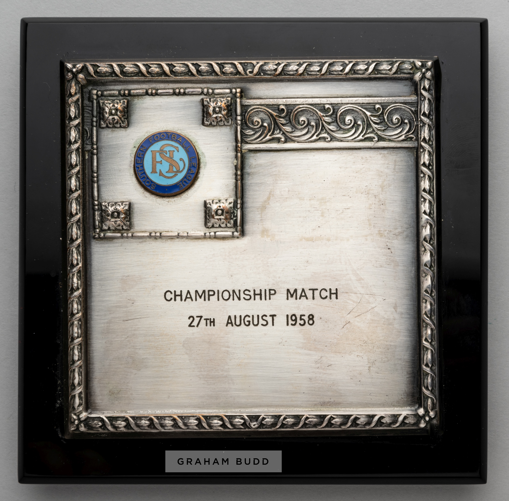 Southern Football League plaque awarded to Gravesend & Northfleet's Jimmy Logie for the championship match v Cheltenham Town, played at Gravesend, 27th August 1958, white metal plaque with enamelled SOUTHERN FOOTBALL LEAGUE badge and engraved CHAMPIONSHIP MATCH 27TH MARCH, applied to a black bakelite plaque, 14 by 14cm., missing easel back This match was between the Southern League cup winner's Cheltenham and Southern League champions Gravesend & Northfleet, Cheltenham won 2-1. Gravesend & Northfleet were the Southern League champions in the 1957-58 season, this was the only time they won the league. In the following 1958-59 season the Southern League was split into two regions, North Western and South Western. Jimmy Logie played with Arsenal during 1935-55 and Gravesend & Northfleet during 1955-60.