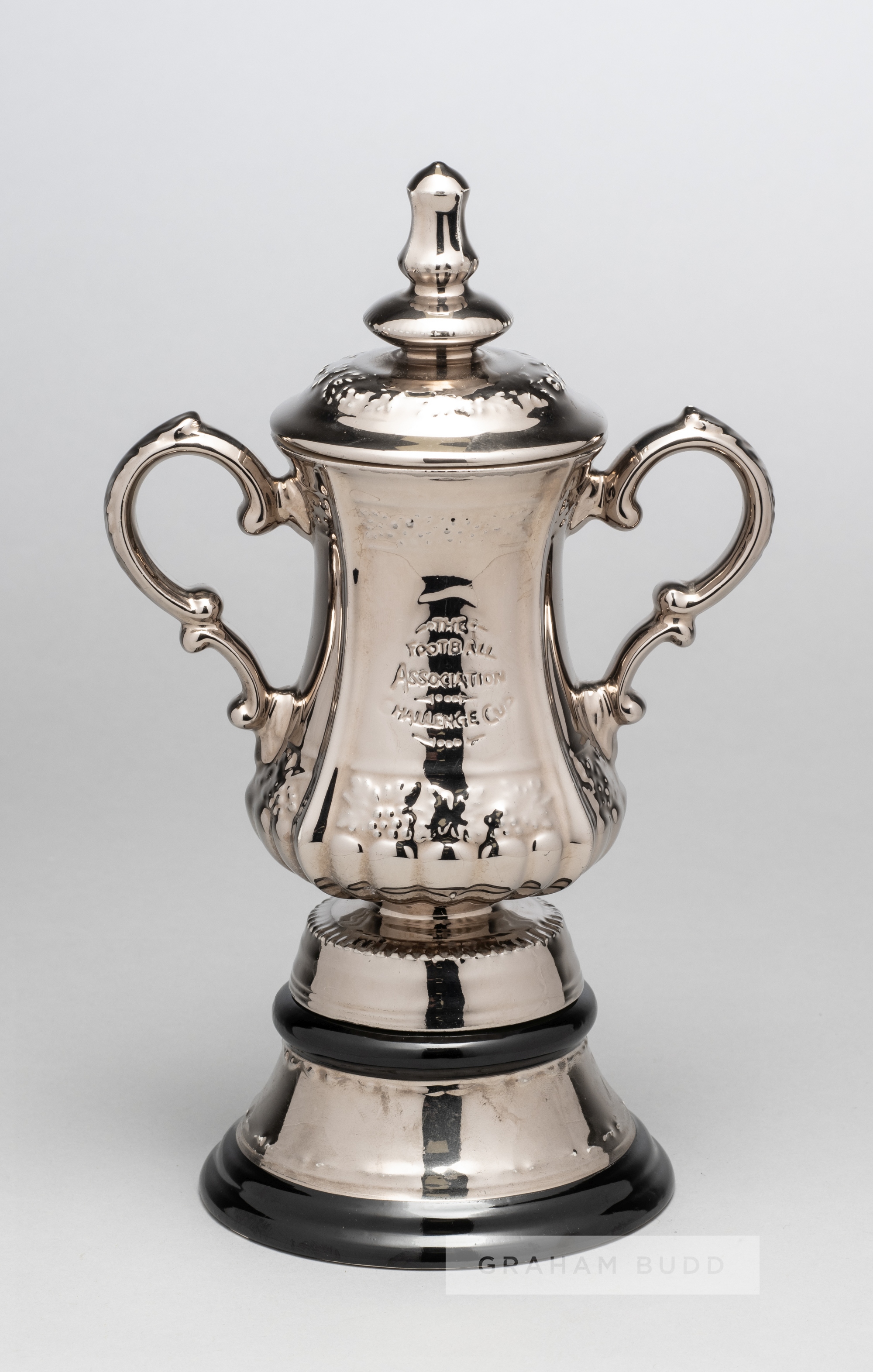 A ceramic miniature replica of the F.A. Cup trophy circa 1950s, twin handled with impressed lettering, knopped lid and circular stand, markers stamp in underside of stand, height 24cm.