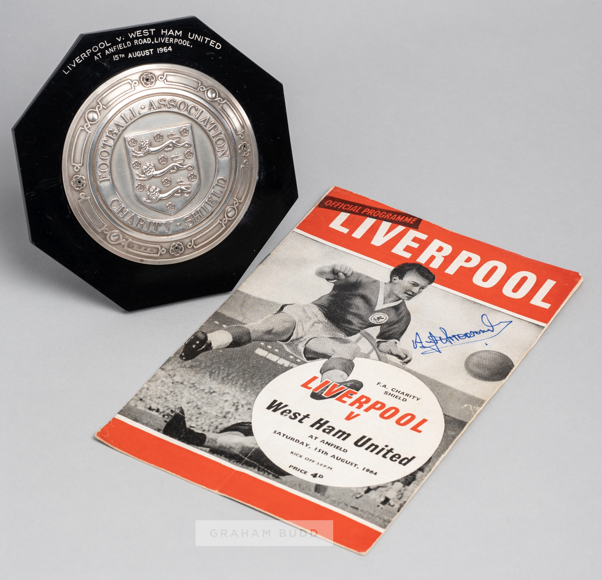 Alf Arrowsmith's Football Association Charity Shield plaque for Liverpool v West Ham United, played at Anfield, 15th August 1964, the silver roundel with three lion shield in relief and FOOTBALL ASSOCIATION CHARITY SHIELD, upon an octagonal plaque bearing LIVERPOOL V WEST HAM UNITED AT ANFIELD ROAD, LIVERPOOL 15TH AUGUST 1964, hallmarked silver London 1960 by H Phillips, 13.5 by 13cm., sold with Alf Arrowsmith signed match programme, signed in blue ink on front cover, (2) This fixture resulted in a 2-2 draw with Alf Arrownsmith badly injured in the 1th minute and replaced by Phil Chisnall.