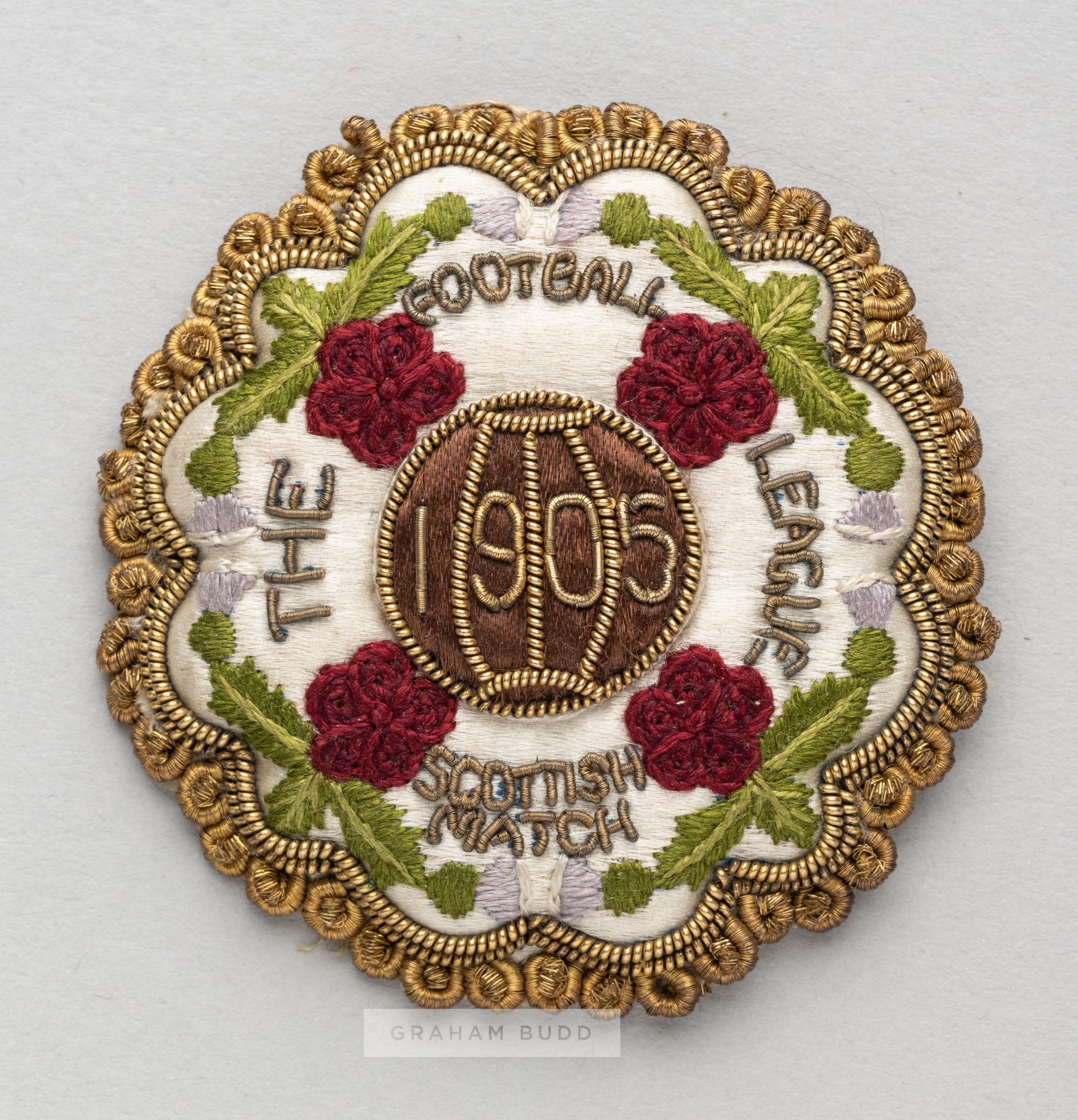Football League representative badge v Scottish League, played at Hampden Park, 11th March 1905, silk lobed gilt wirework and tassel badge embroidered with THE FOOTBALL LEAGUE 1905 SCOTTISH MATCH with red rose head decoration, the paper back with pin clasp bearing W McGREGOR BIRMINGHAM ink stamp and hand written notes, diameter 5.5cm. Football League defeated Scottish League 3-2, with goals by Charlie Roberts, Steve Bloomer and Jack Parkinson for FL and by Jimmy Quinn and Charles Thomson for SL.