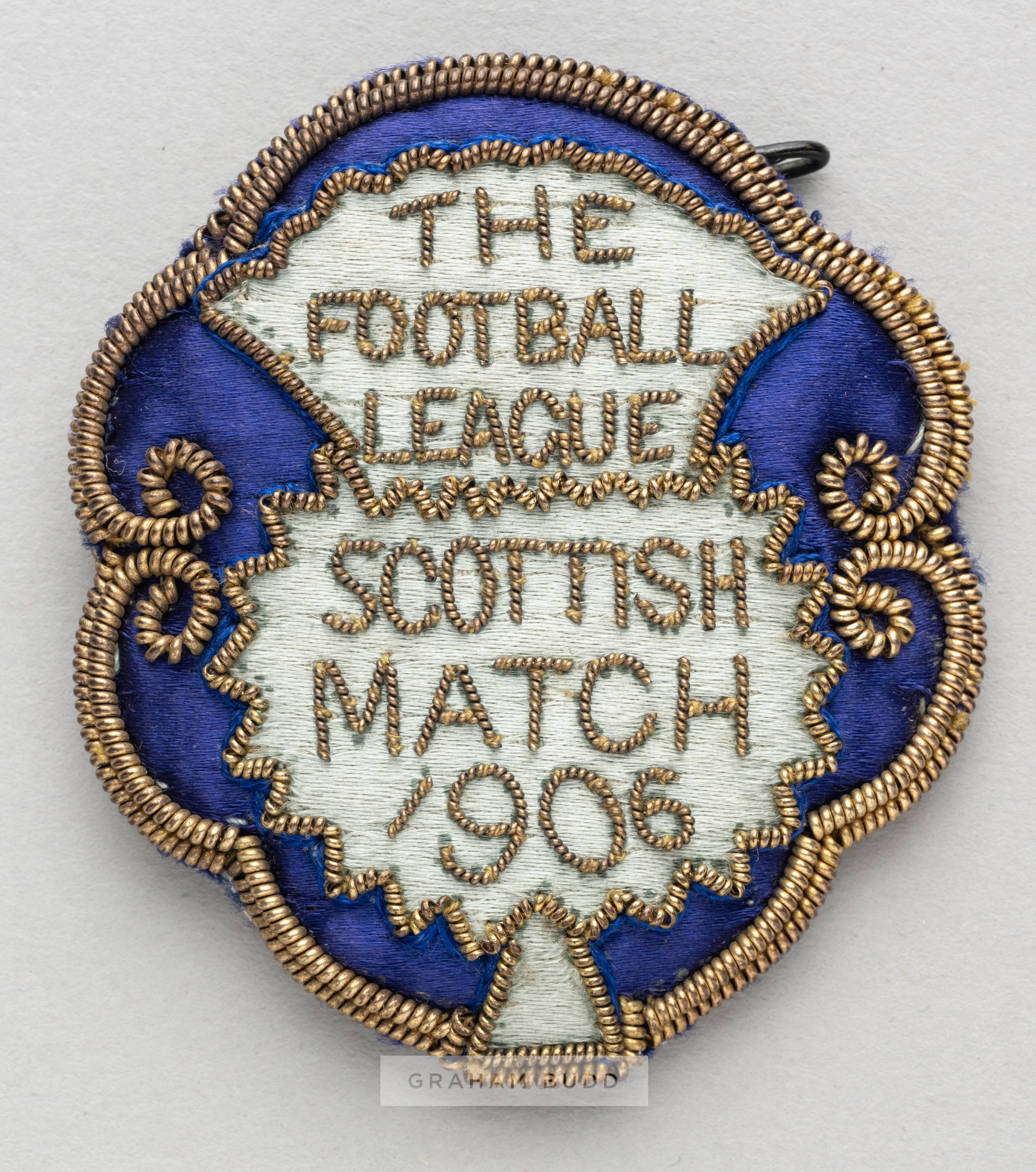 Football League representative badge v Scottish League, played at Stamford Bridge, 24th March 1906, silk lobed gilt wirework badge embroidered with THE FOOTBALL LEAGUE SCOTTISH MATCH 1906 within a thistle shaped motif, paper back with pin clasp bearing W McGREGOR BIRMINGHAM ink stamp, 5.5 by 5cm. Football League defeated Scottish League 6-2, with goals by Albert Shepherd (4), Alf Common and Joe Bache for FL and by Archie Kyle and Charles Thomson for SL.