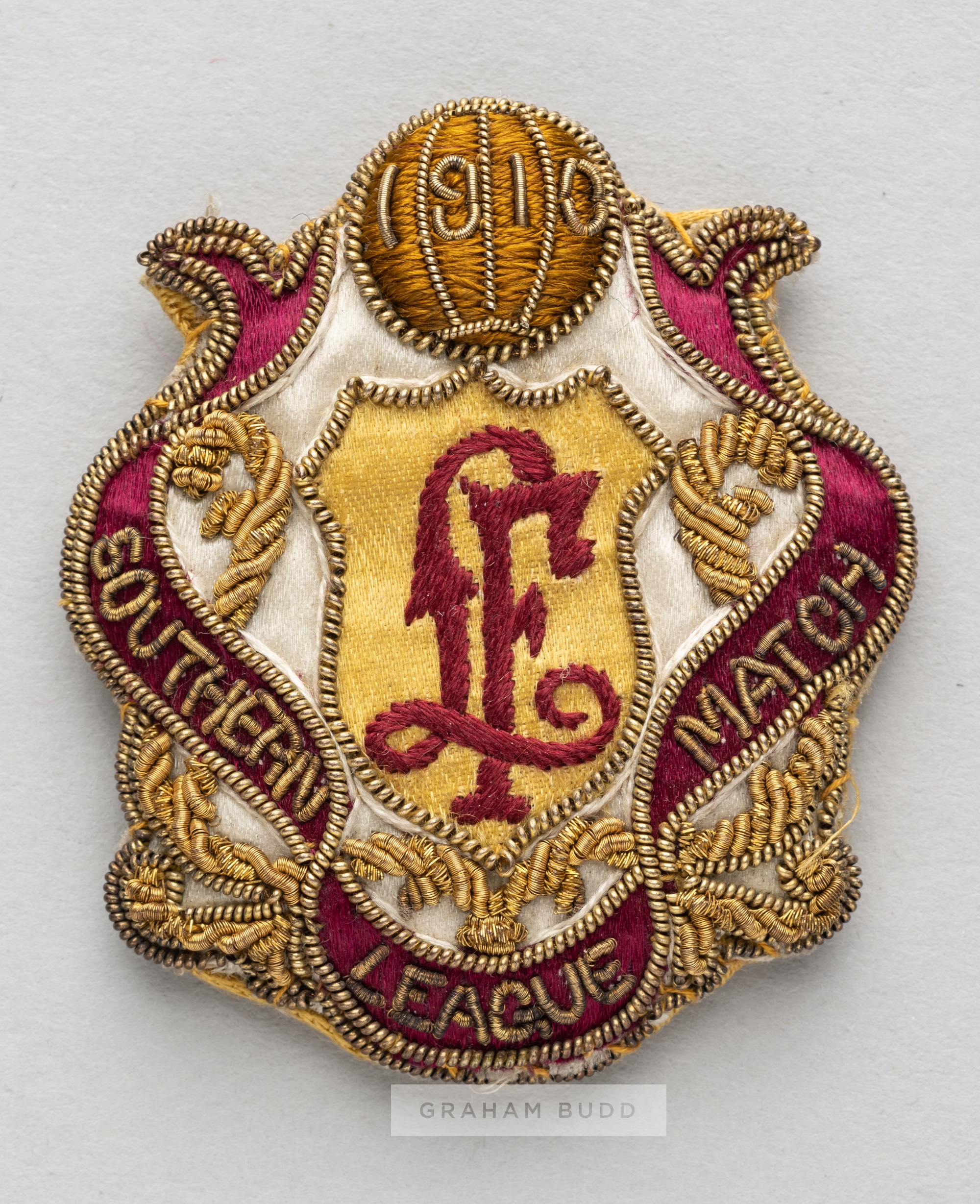 Football League representative badge v Southern League, played at Stamford Bridge, 11th April 1910, bearing a name stamp for the important early football administrator William McGregor, silk shield shaped with gilt wirework, embroidered 1910 SOUTHERN LEAGUE MATCH, paper back with pin clasp bearing W McGREGOR BIRMINGHAM ink stamp, 5.5 by 5cm. This fixture resulted in a 2-2 draw, with goals by Jimmy Stewart and Jack Parkinson for FL and by A Lewis and Harold Fleming for SL.