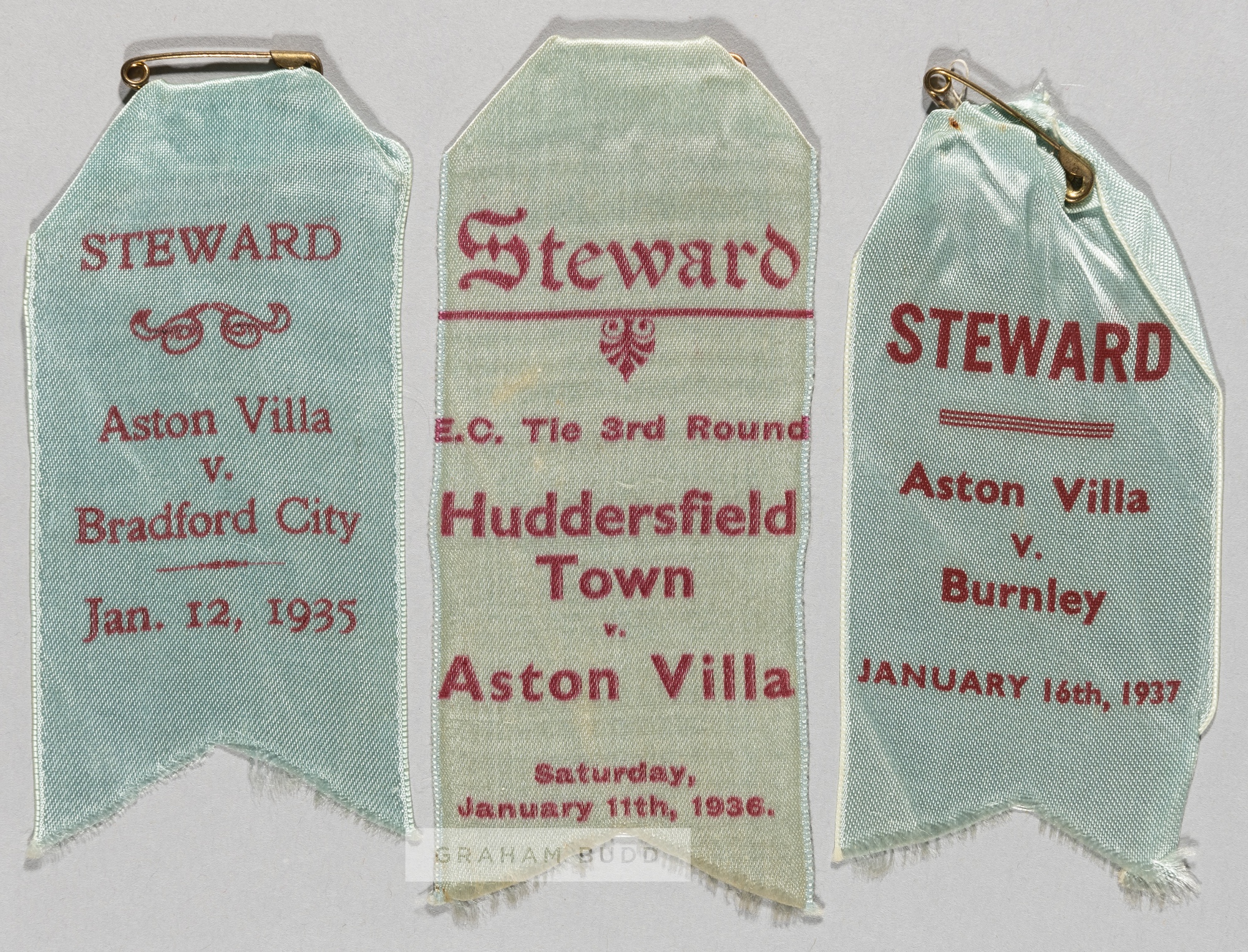 Three Aston Villa stewards' silk badges, comprising v Bradford City, 12th January 1935; v Huddersfield Town 11th January 1936 in the E.C. tie third round; v Burnley 16th January 1937, blue silk badges with red lettering, largest 11.5 by 5cm., (3)