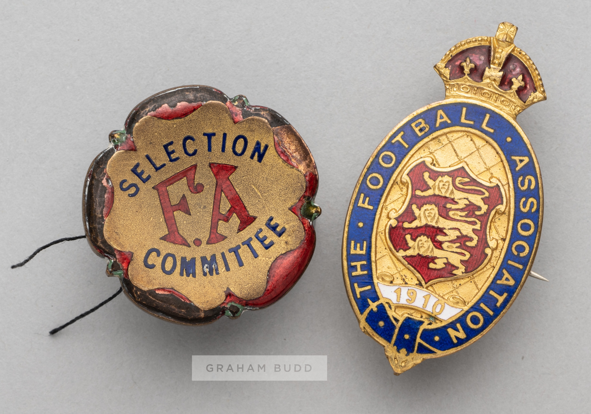 The Football Association Selection Committee badge originally issued to Charles James Hughes (1853-1916), the rare badge with red and blue enamel on gilt metal, enamel loss around the border; sold together with Hughes' Football Association officials badge for 1910, (2)