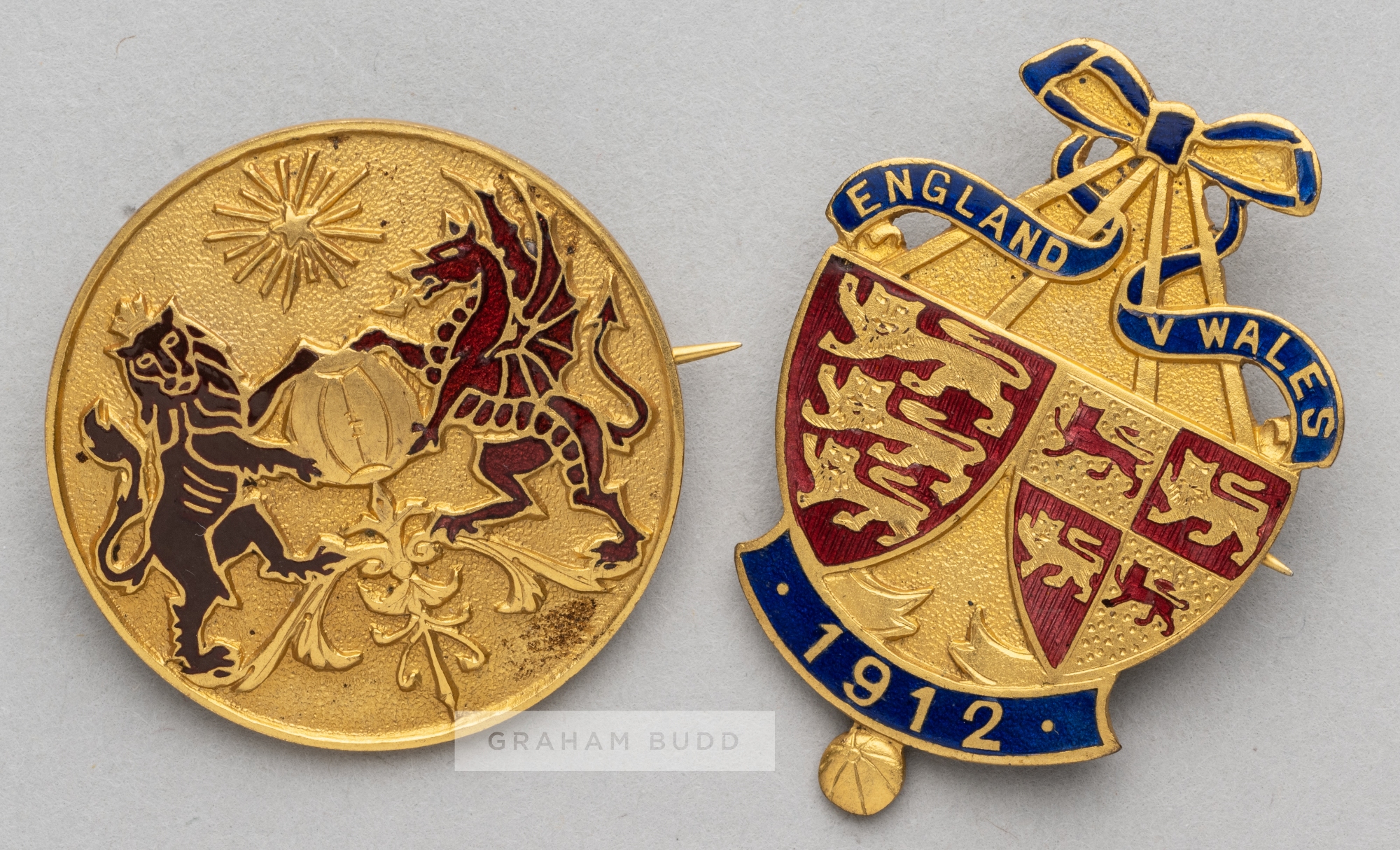 Two Football Association badges issued to F.A. official Charles James Hughes (1853-1916) for England v Wales international matches, both in gilt metal and enamel, one dated 1912 and the other undated but from a similar period, (2)