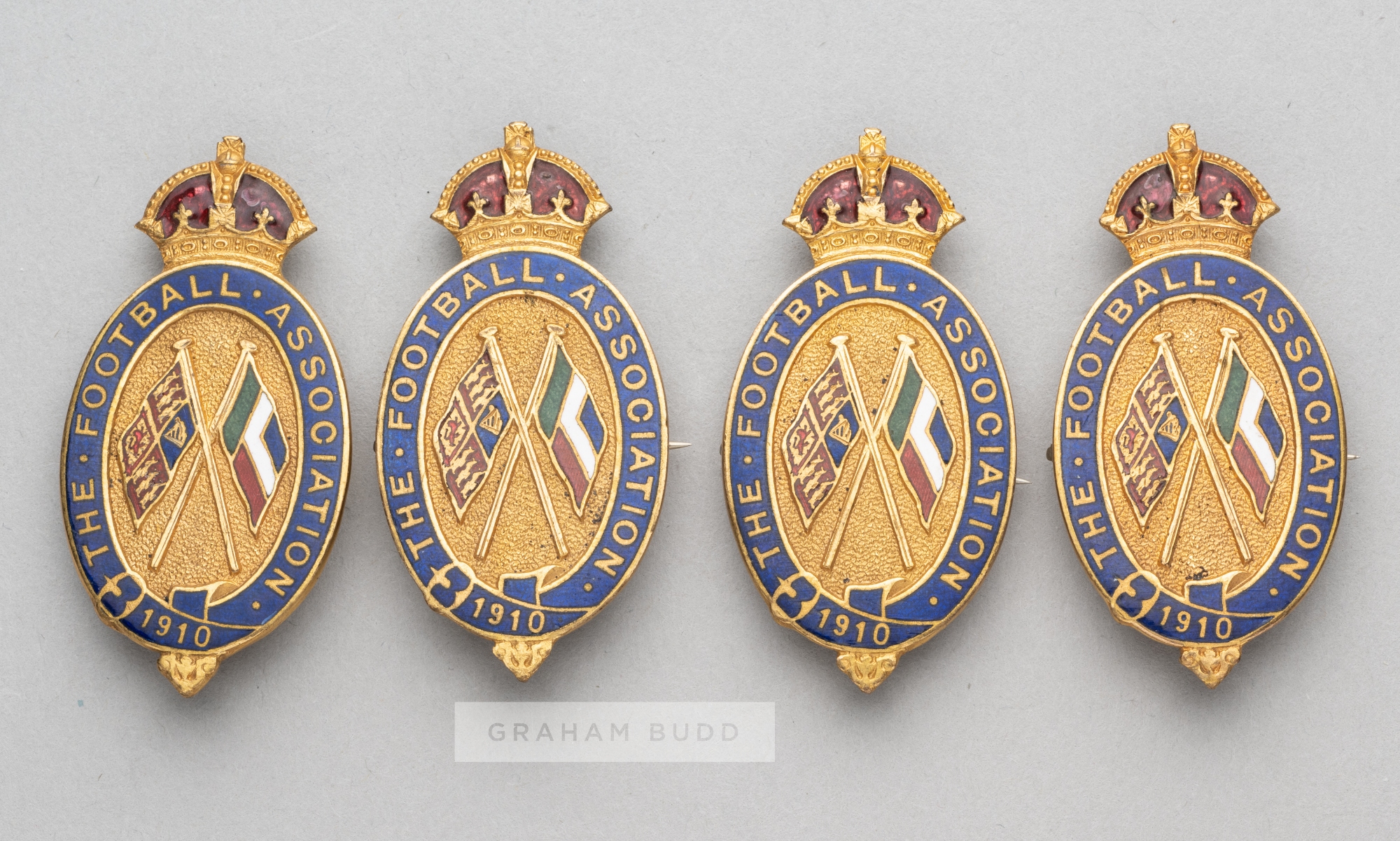 Four identical Football Association badges issued to F.A. official Charles James Hughes (1853-1916) for the Home International fixtures in 1910, all