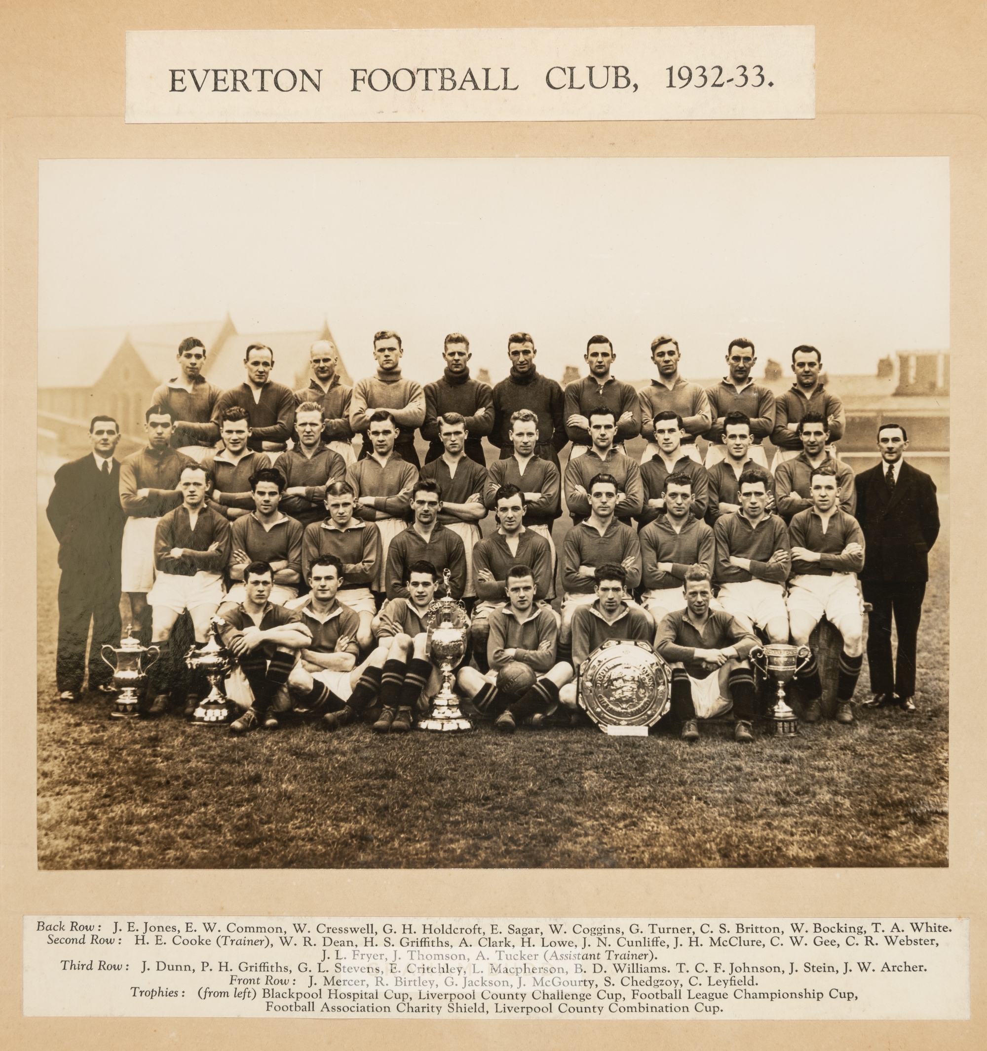 Official Everton b&w team-group photograph season 1932-33, bearing details of the clubs's achievements in this season, Blackpool Hospital Cup, Liverpool County Challenge Cup, Football Association Challenge Cup, Football Association Charity Shield, Liverpool County Combination Cup Harry Holdcroft (Preston North End, Everton and England goalkeeper) Lots 641 to 665 George Henry Holdcroft (known as Harry) 1909 – 1983 played for Port Vale and Darlington before moving to Everton and was part of their chamionship winning squad of 1931-1932 but he is perhaps best known for his time at Preston North End making 172 consecutive appearances (263 in total) helping the Lambs to promotion in 1933-34. He also kept a clean sheet in their 1938 FA Cup final victory over Huddersfield town. Holdcroft was selected to play for England twice in the 1936 Home Internationals against Wales and Ireland.
