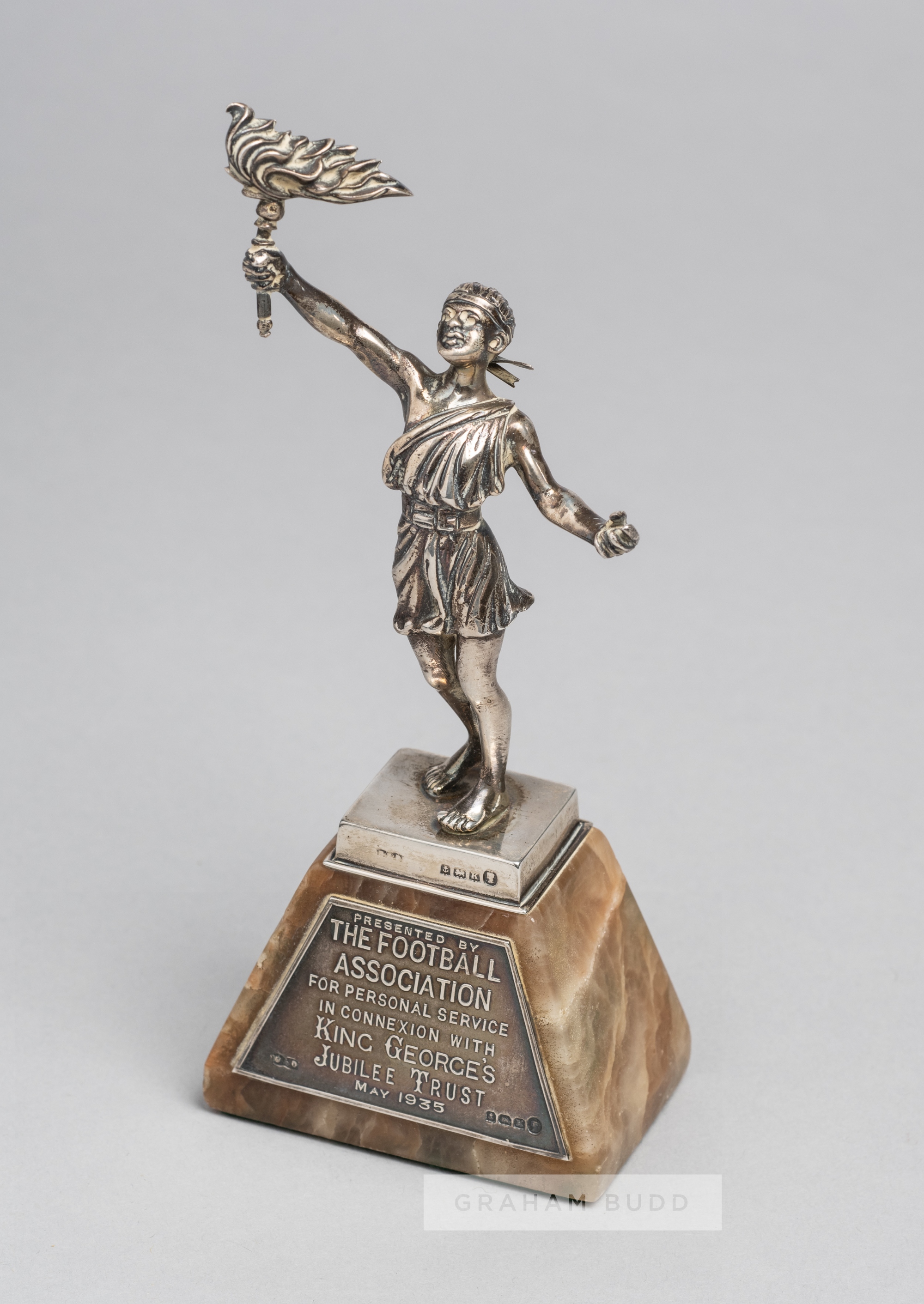 King George's Jubilee Trust silver trophy presented to the Preston North End goalkeeper George "Harry" Holdcroft, on marble base inscribed "presented by The Football Association for personal service in connecion with King George's Jubilee Trust May 1935 GH Holdcroft"., hallmarked silver, Denton & Down, Birmingham, 1934, height (including base) 16cm. Harry Holdcroft (Preston North End, Everton and England goalkeeper) Lots 641 to 665 George Henry Holdcroft (known as Harry) 1909 – 1983 played for Port Vale and Darlington before moving to Everton and was part of their chamionship winning squad of 1931-1932 but he is perhaps best known for his time at Preston North End making 172 consecutive appearances (263 in total) helping the Lambs to promotion in 1933-34. He also kept a clean sheet in their 1938 FA Cup final victory over Huddersfield town. Holdcroft was selected to play for England twice in the 1936 Home Internationals against Wales and Ireland.