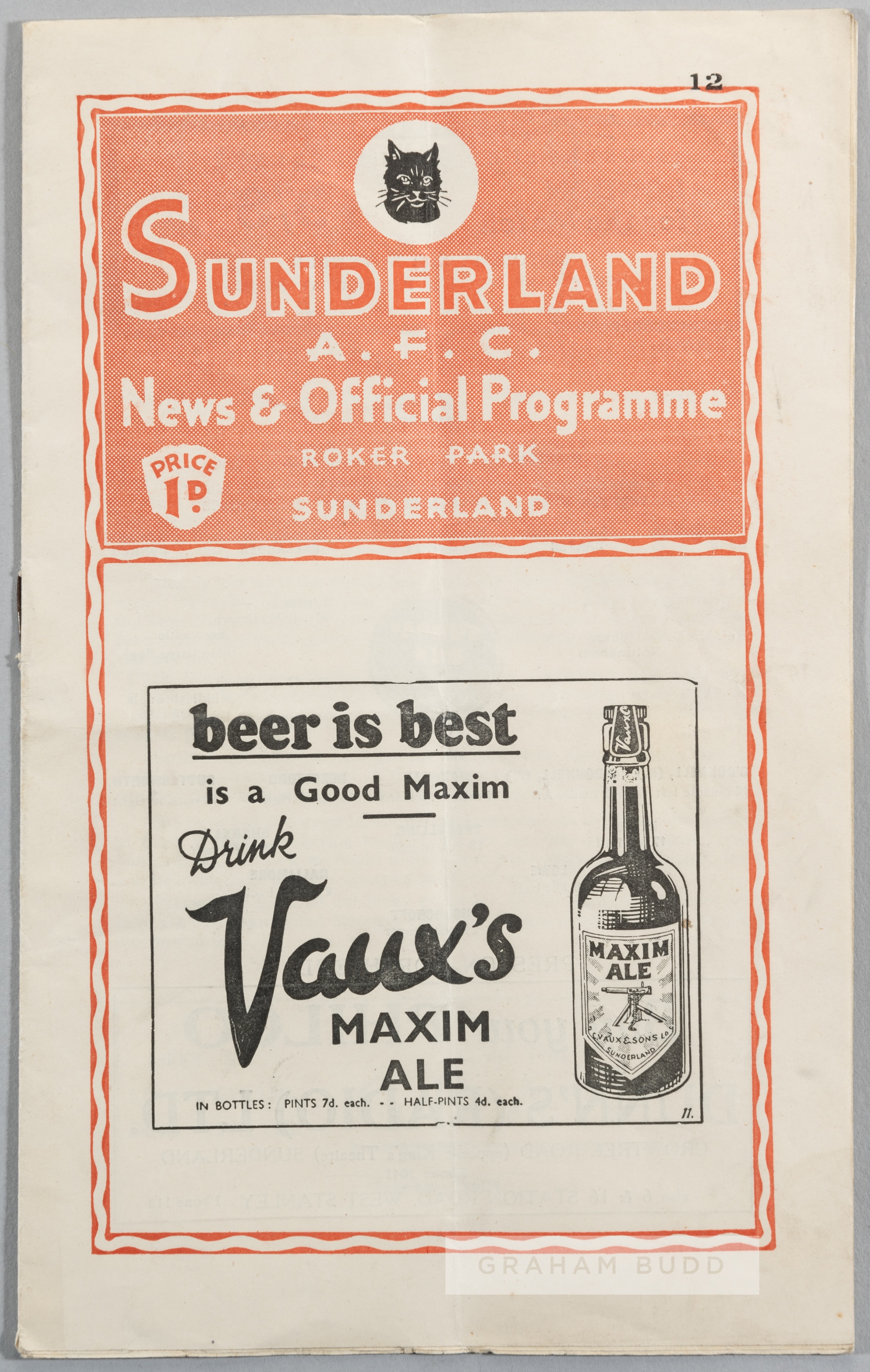 Sunderland v Preston North End programme 9th November 1935, personal copy of PNE's goalkeeper George "Harry Holdcroft", vertical fold throughout Har