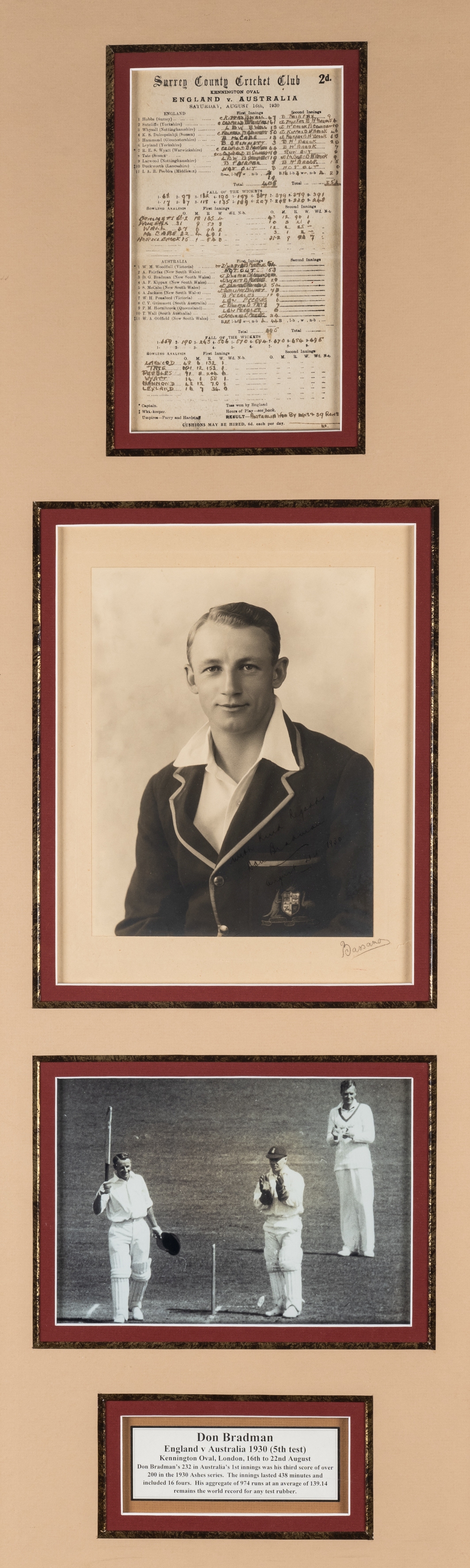 Don Bradman's 232 score cricket display for England v Australia Ashes fifth test at Kennington Oval, 16th-22nd August 1930, comprising a Surrey County cricket club hand annotated scorecard; 9 by 7in. b & w photograph of Don Bradman wearing the Australian cricket blazer; b & w photograph of Don Bradman being clapped off the pitch, all mounted above legend, glazed and framed, overall 114 by 42cm. Don Bradman England v Australia 1930 (5th test), Kennington Oval, London, 16th to 22nd August , Don Bradman's 232 in Australia's 1st innings was his third score of over 200 in the 1930 Ashes series. The innings lasted 48 minutes and included 16 fours. His aggregate of 974 runs at an average of 139.14 remains the world record for any test series. Please be aware all glass will be removed from framed and glazed items prior to posting and may result in delays to shipping your items. (This service is included in the cost of postage and packing). We can also totally remove all framing and mounts upon request to reduce shipping costs. Alternatively lots can be collected in person by prior appointment from NN8 1RT.