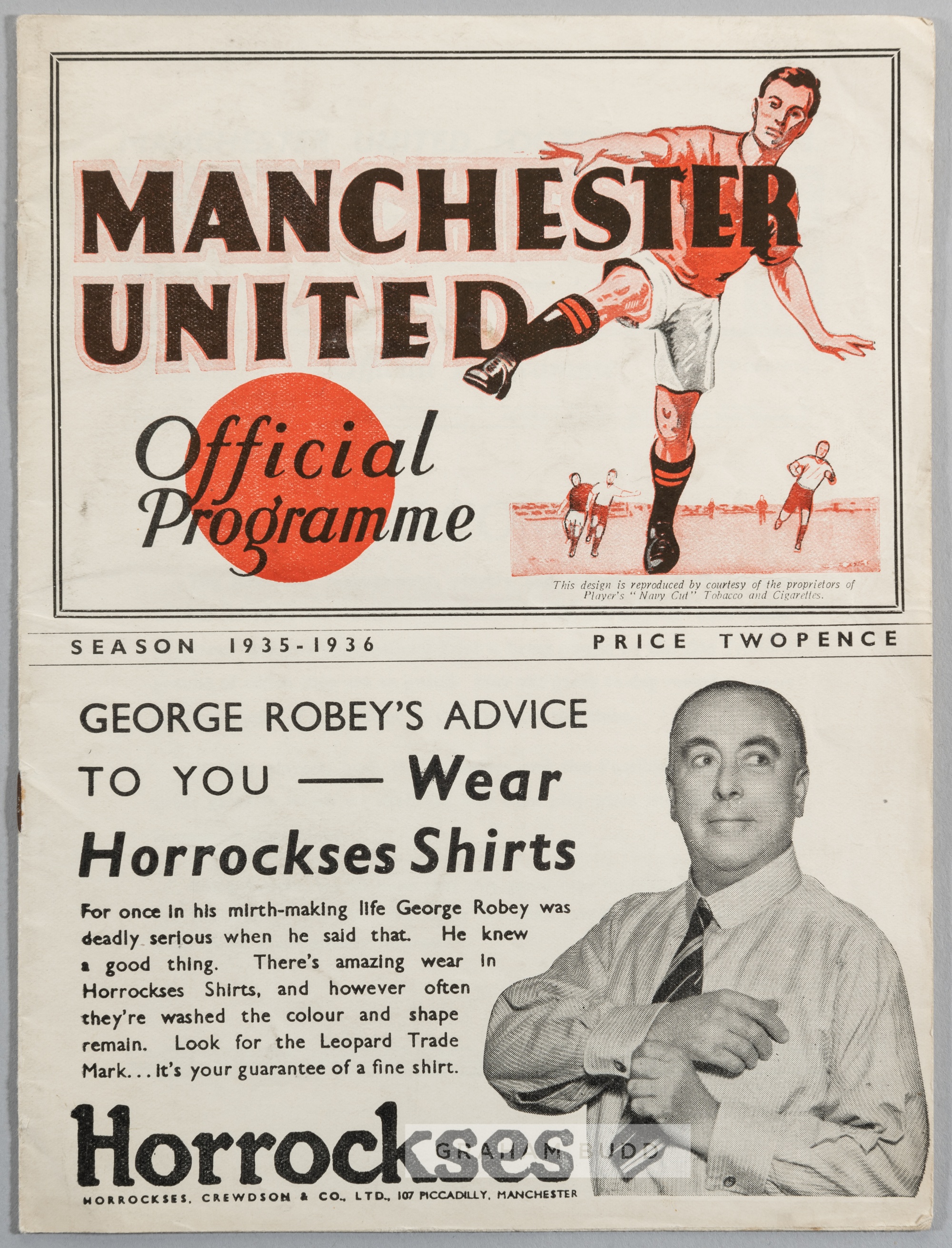 Manchester United programme issued for the Football Association England Trial match 25th March 1936, personal copy of the Preston North End goalkeeper George "Harry" Holdcroft, played at Old Trafford, the Probables beat the Possibles 3-0. Harry Holdcroft (Preston North End, Everton and England goalkeeper) Lots 641 to 665 George Henry Holdcroft (known as Harry) 1909 – 1983 played for Port Vale and Darlington before moving to Everton and was part of their chamionship winning squad of 1931-1932 but he is perhaps best known for his time at Preston North End making 172 consecutive appearances (263 in total) helping the Lambs to promotion in 1933-34. He also kept a clean sheet in their 1938 FA Cup final victory over Huddersfield town. Holdcroft was selected to play for England twice in the 1936 Home Internationals against Wales and Ireland.