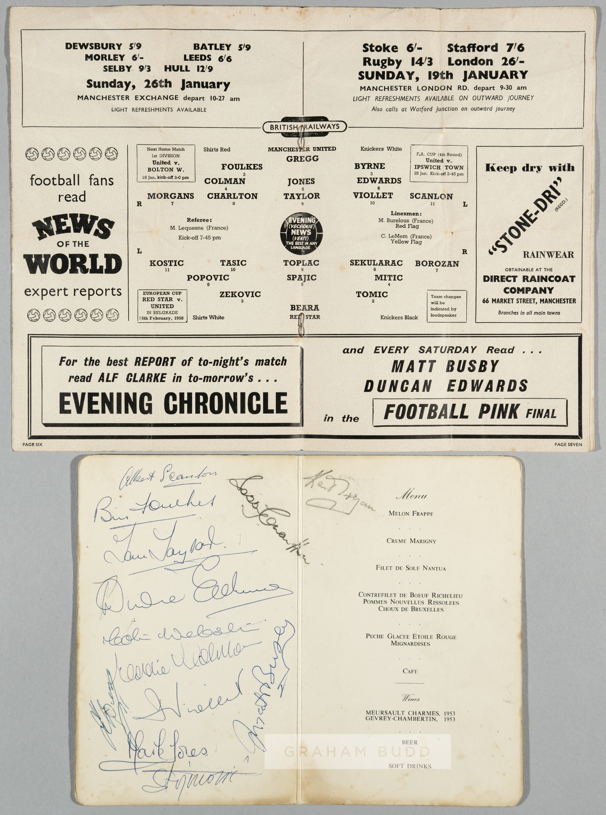 Signed Midland Hotel Manchester dinner menu card from the Manchester United v Red Star Belgrade European Cup tie First Leg 14th January 1958, signed by13 of the Manchester team and management, including Busby, Scanlon, Foulkes, Taylor, Webster, Edwards, Jones, Viollet, Colman and more, signed in ink; sold with the match programme, programme bears wear with creases and folds (2)