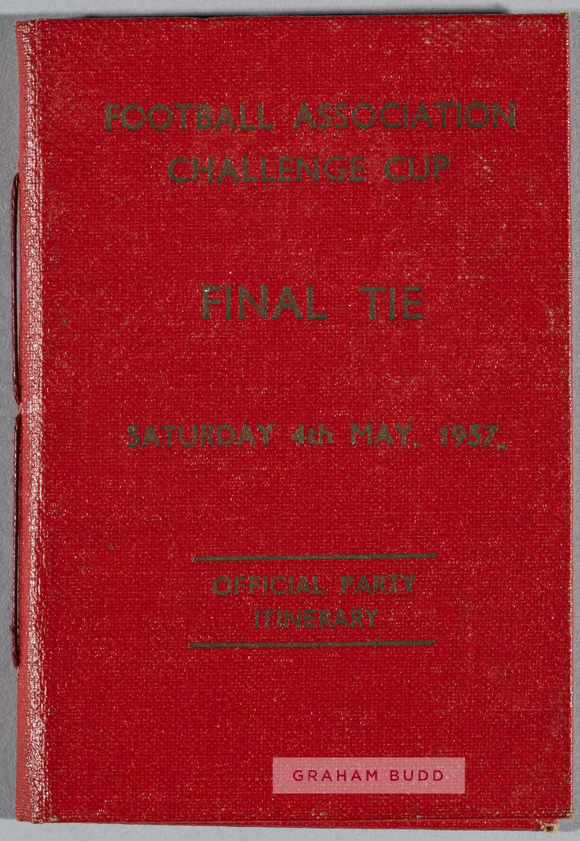 Duncan Edwards' official Manchester United itinerary for the 1957 FA Cup final at Wembley, the small red cloth hardbound booklet detailing travel and accommodation arrangements between Friday 3rd and Sunday 5th May, good condition Lots 669 to 710 Provenance: The Molly Leech Collection. Fiancée to Duncan Edwards of Manchester United and England. Thence by family descent.