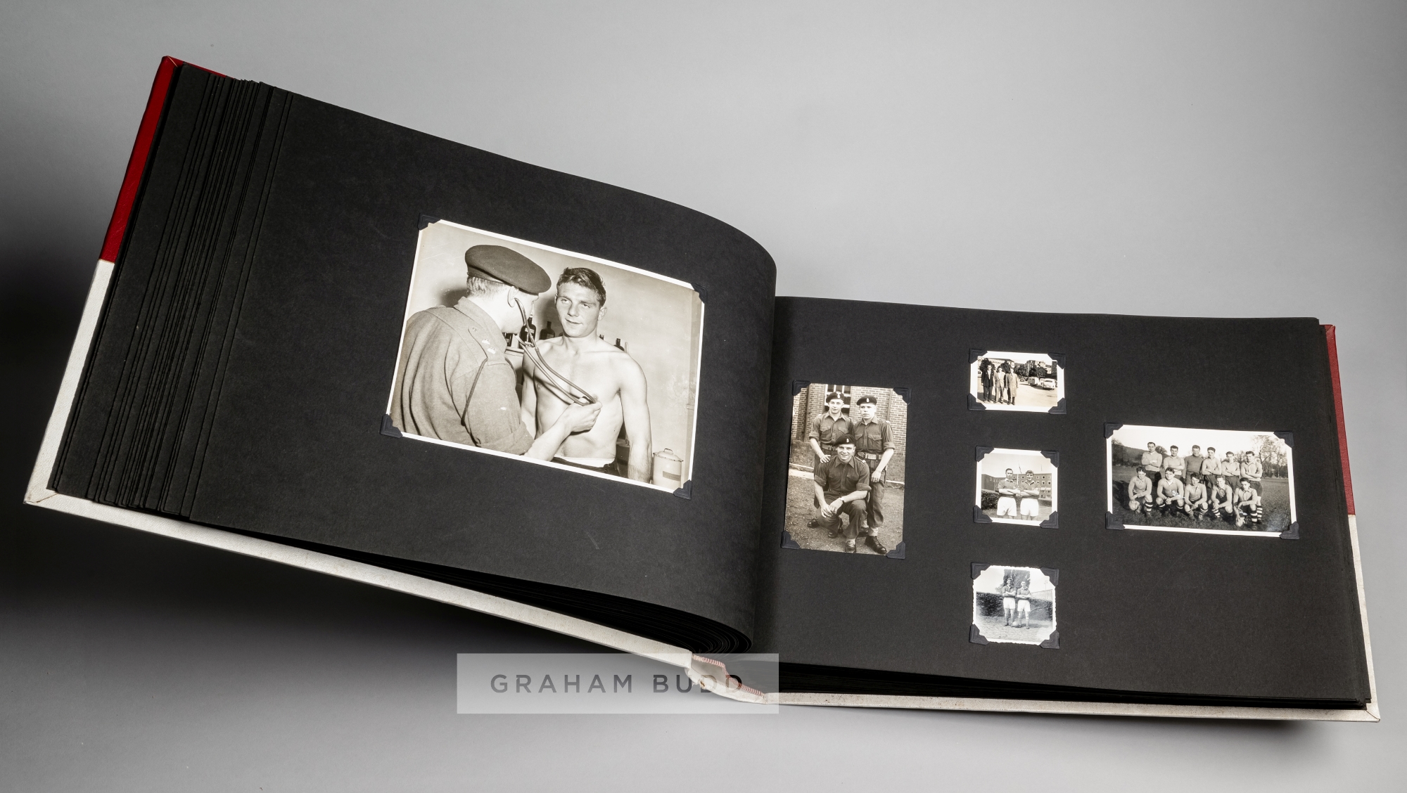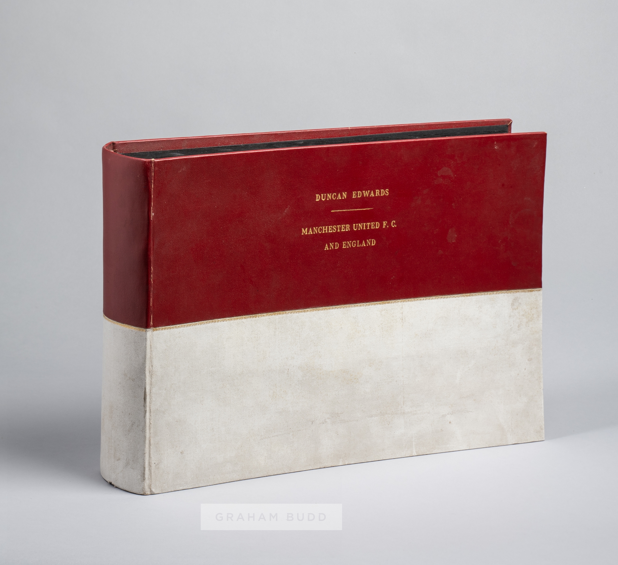 Duncan Edwards' family photograph album for his Manchester United and England football career, the high quality album in red and white leather cloth with gilt tooling DUNCAN EDWARDS MANCHESTER UNITED FC AND ENGLAND, containing a quantity of hinge-mounted b & w press photographs, subjects including portraits, match action, scenes taken with Manchester United team-mates at formal functions, moments of relaxation and at the training ground and stadium, some examples bearing autographs, also photographs from his period of National Service, the 1957 F.A. Cup Final, England international duties, his work as a writer and recreational pursuits including a passion for fishing, overall in good condition Lots 669 to 710 Provenance: The Molly Leech Collection. Fiancée to Duncan Edwards of Manchester United and England. Thence by family descent.