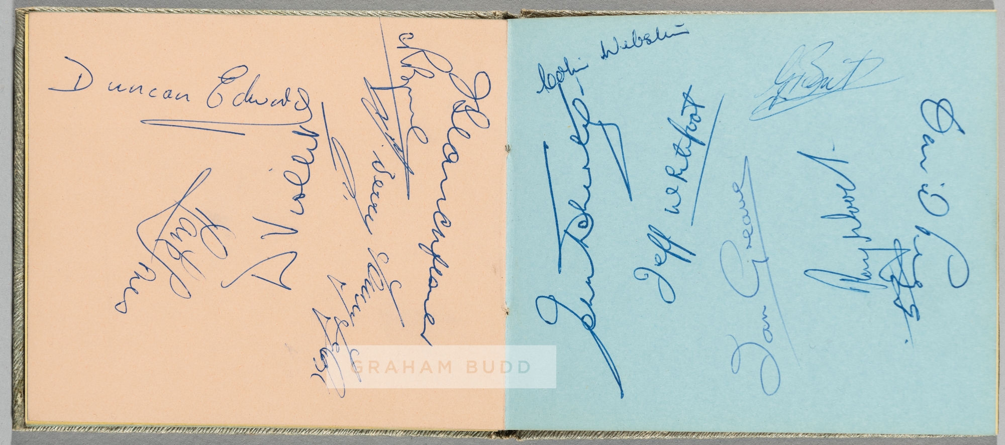 An autograph book containing a double-page of Manchester United Busby Babes autographs collected by Duncan Edwards for his fiancée Molly Leech, autographs including Edwards, Jones, Viollet, Byrne, Berry, Taylor, Blanchflower, Webster, Doherty, Whitefoot, Greaves, Wood, Bent and Pegg, the album also containing the signatures of the England team v an Irish XI, including Edwards, Byrne, Baynham, Armfield, Grainger, and others, 11 signatures in total, a few other autographs elsewhere most notably Stan Mortensen, good condition Lots 669 to 710 Provenance: The Molly Leech Collection. Fiancée to Duncan Edwards of Manchester United and England. Thence by family descent.