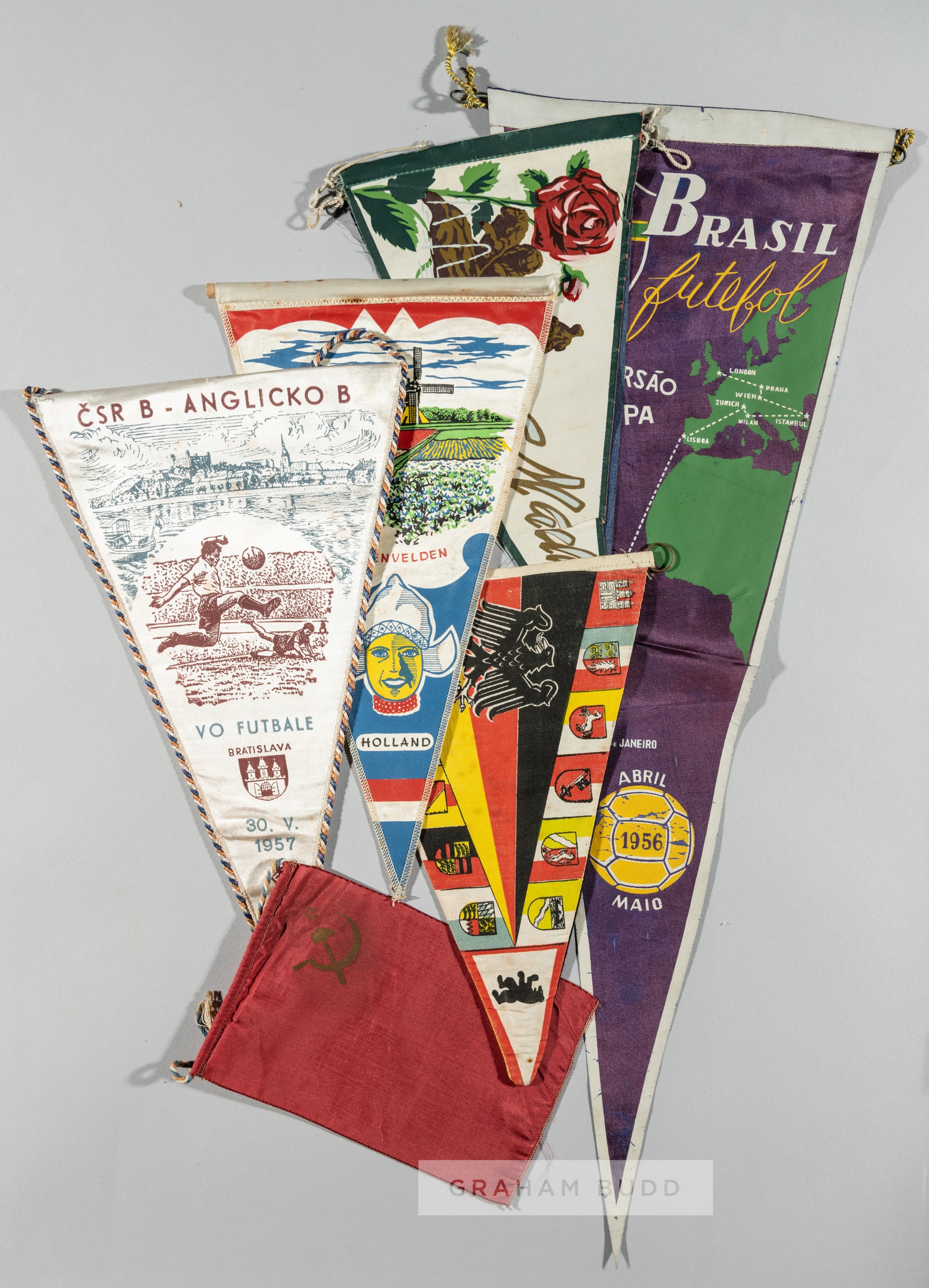 Match pennants collected by Duncan Edwards of Manchester United and England, comprising an example inscribed for the England B international v Czechoslovakia in Bratislava 30th May 1957, a Brazil pennant for their European tour in April and may 1956 including England, USSR, West Germany (2), City of Vienna, City of Madrid, City of Les Broek, Czechoslovakia, Cities of Dusseldorf, Frankfurt and Cologne and the Netherlands, (13) Lots 669 to 710 Provenance: The Molly Leech Collection. Fiancée to Duncan Edwards of Manchester United and England. Thence by family descent.