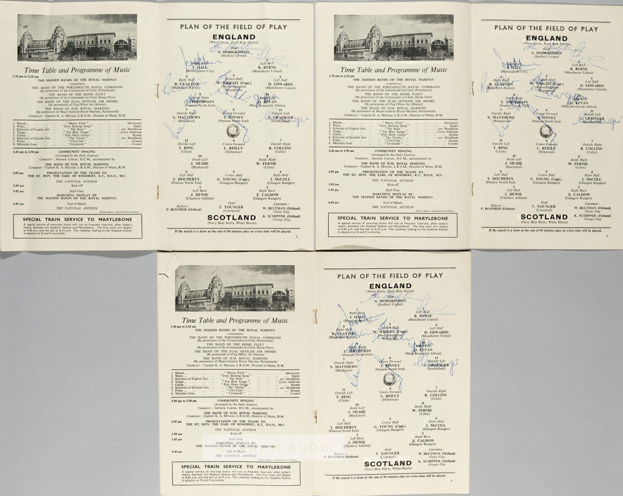 Three autographed programmes for the England v Scotland match played at Wembley, 6th April 1957, each signed on the team line-up page by the England team with the exception of Duncan Edward who had collected the autographs for his fiancée Molly Leech but had not thought to sign over his own name, signatures comprising Hodgkinson, Byrne, Hall, Clayton, Wright, Thompson, Kevan, Matthews, Finney and Grainger, good condition, (3) Lots 669 to 710 Provenance: The Molly Leech Collection. Fiancée to Duncan Edwards of Manchester United and England. Thence by family descent.
