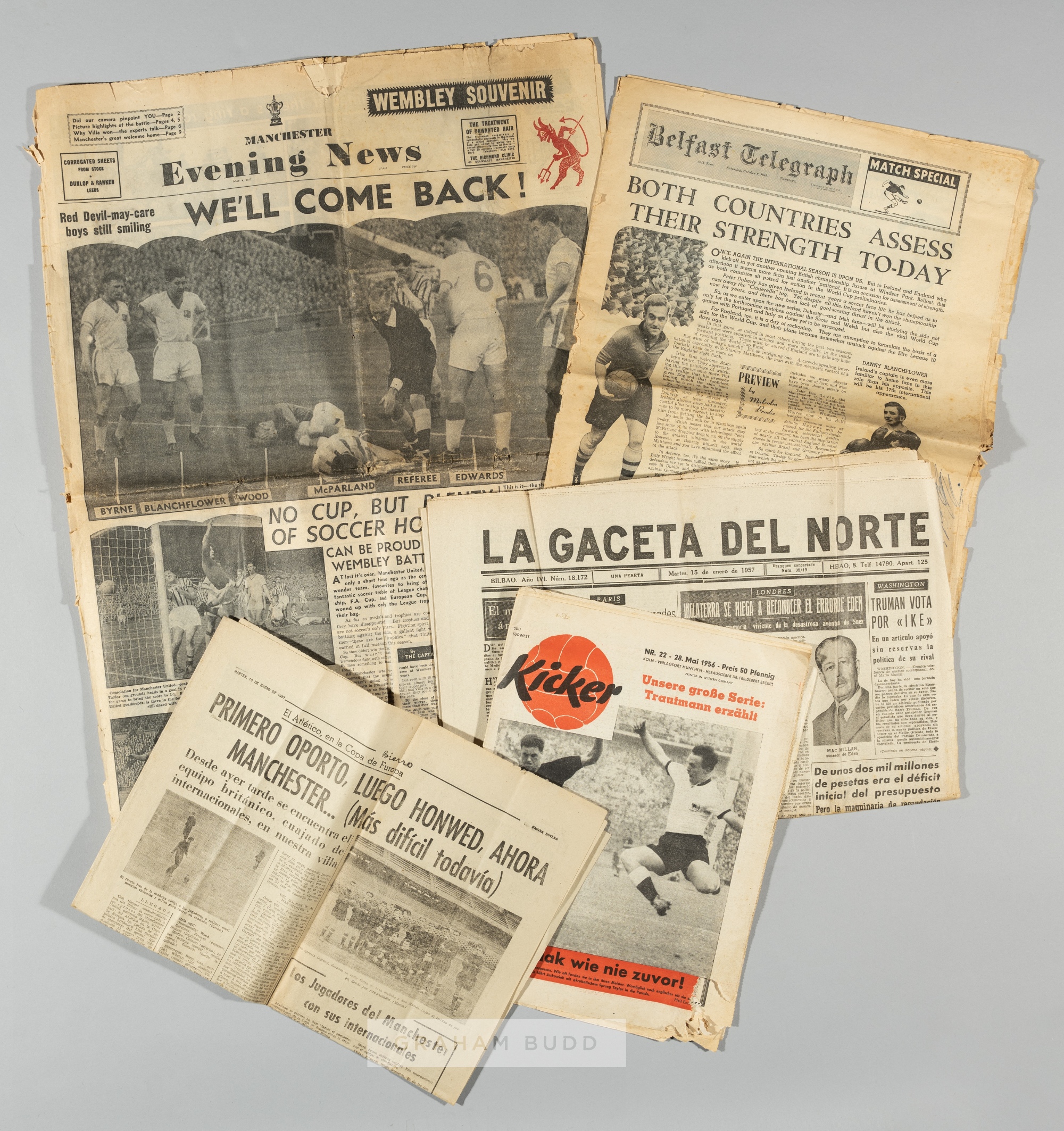 A group of five newspapers and magazines originally kept as souvenirs by Duncan Edwards of Manchester United and England, comprising Spanish newspaper La Gaceta Del Norte 15th January 1957, Bieno 15th January 1957, German Kicker magazine May 1956, Belfast Telegraph 6th October 1956 and Manchester Evening News 1957 FA Cup final Wembley souvenir edition, all featuring matches in which Duncan Edwards played, fair condition for age, (5) Lots 669 to 710 Provenance: The Molly Leech Collection. Fiancée to Duncan Edwards of Manchester United and England. Thence by family descent.