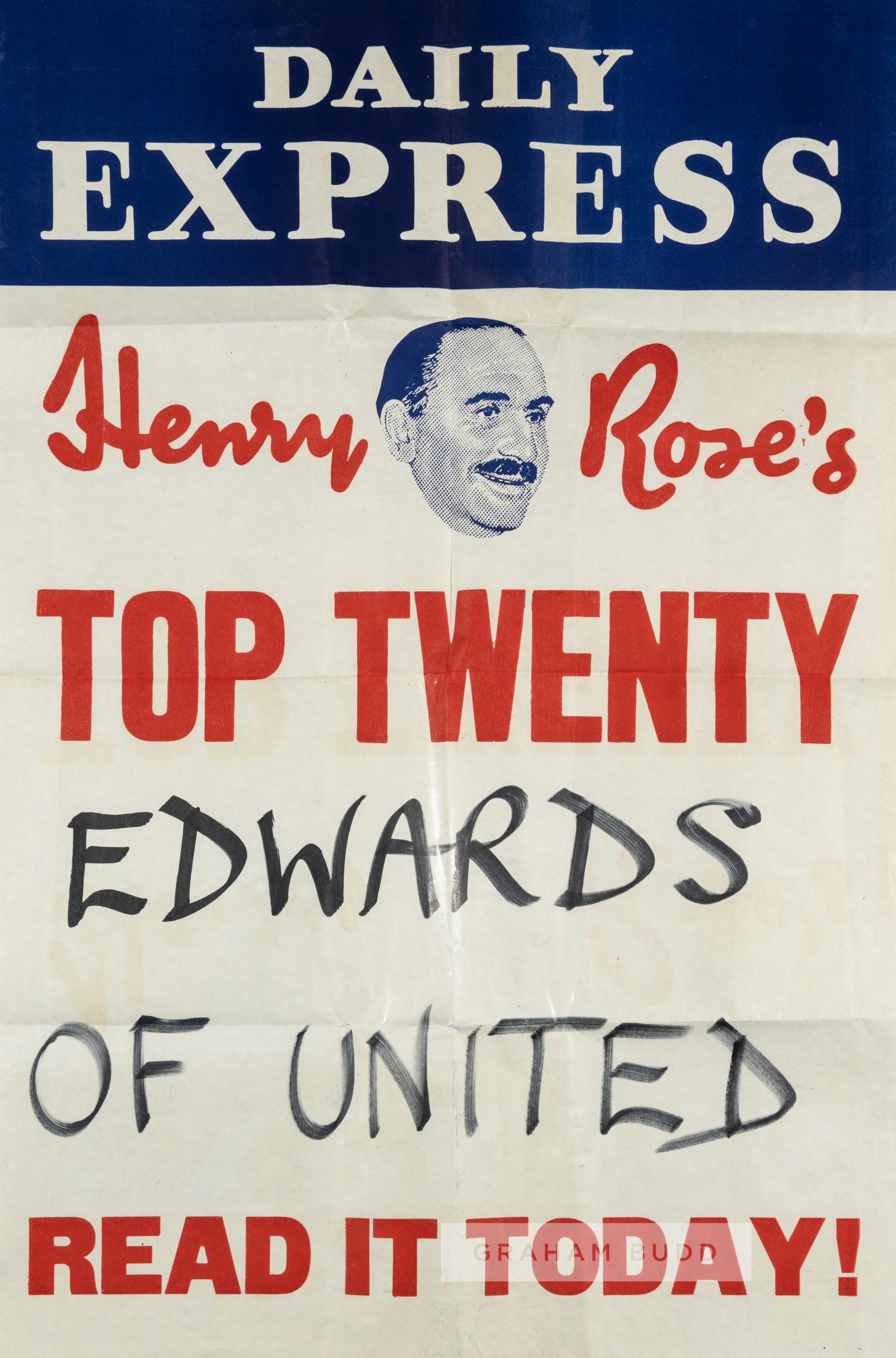 An original 1950s Daily Express news stand poster advertising Henry Rose's feature article on Duncan Edwards of Manchester United and England, 76 by 50cm., good condition folds as issued Lots 669 to 710 Provenance: The Molly Leech Collection. Fiancée to Duncan Edwards of Manchester United and England. Thence by family descent.