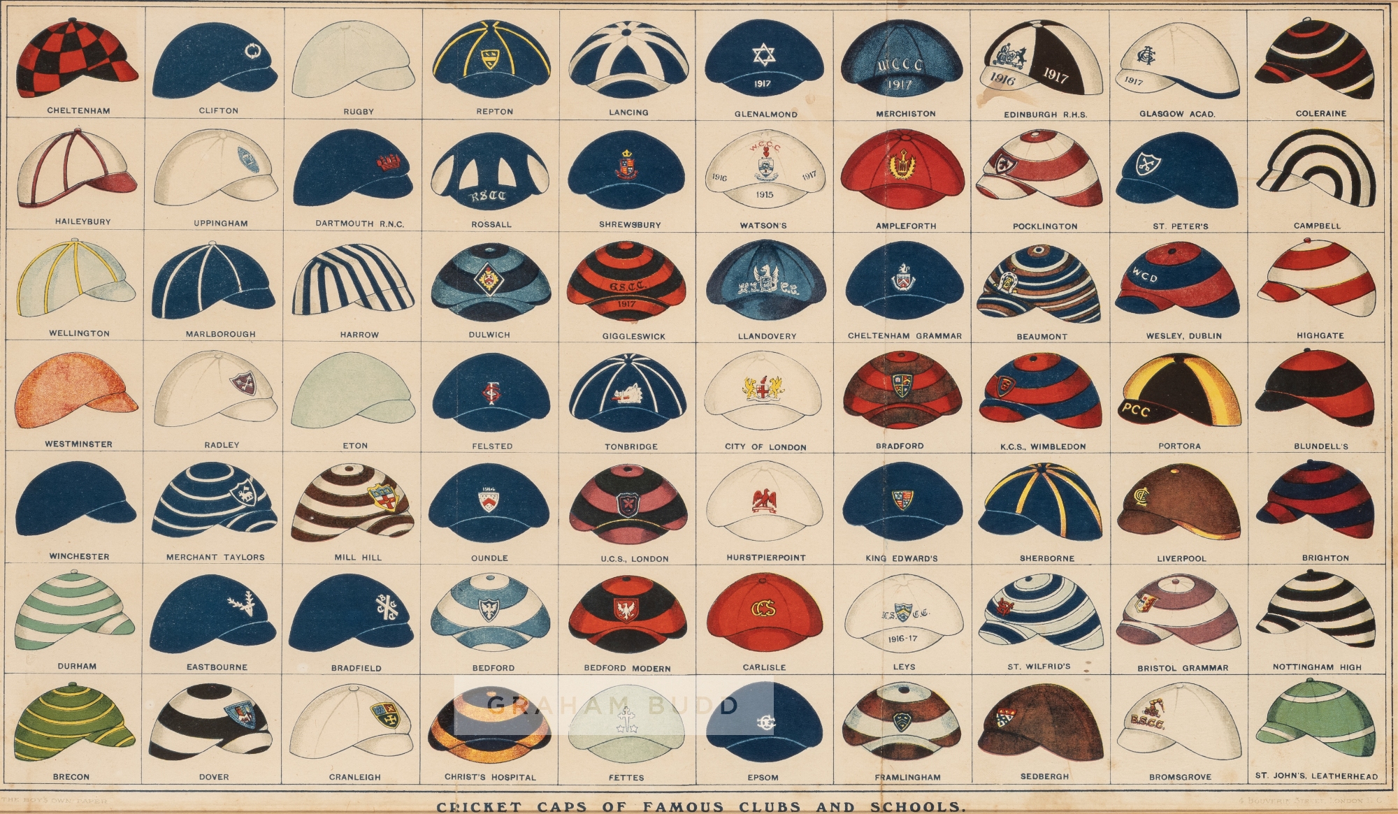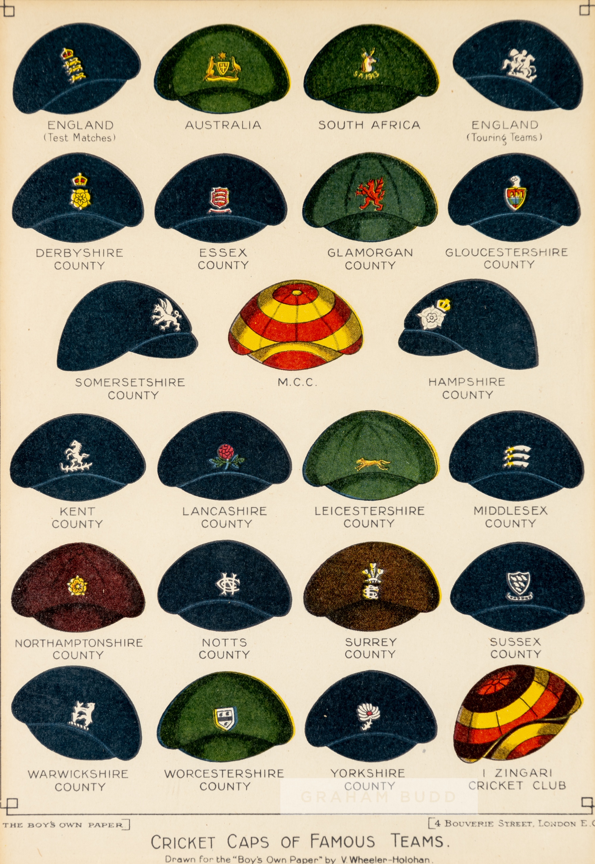 Two Boy's Own Paper lithographs of "Cricket Caps of Famous Teams" and "Cricket Caps of Famous Clubs and Schools", circa 1900, the first featuring international, national and county cricket team caps including England, Australia, South Africa, M.C.C. MIddlesex, and others, glazed and framed, overall 42 by 34cm.; the second featuring cricket clubs and schools of Great Britain including Durham, Eton, Clifton, Dulwich and others, glazed and framed, overall 46 by 66cm., (2) Please be aware all glass will be removed from framed and glazed items prior to posting and may result in delays to shipping your items. (This service is included in the cost of postage and packing). We can also totally remove all framing and mounts upon request to reduce shipping costs. Alternatively lots can be collected in person by prior appointment from NN8 1RT.