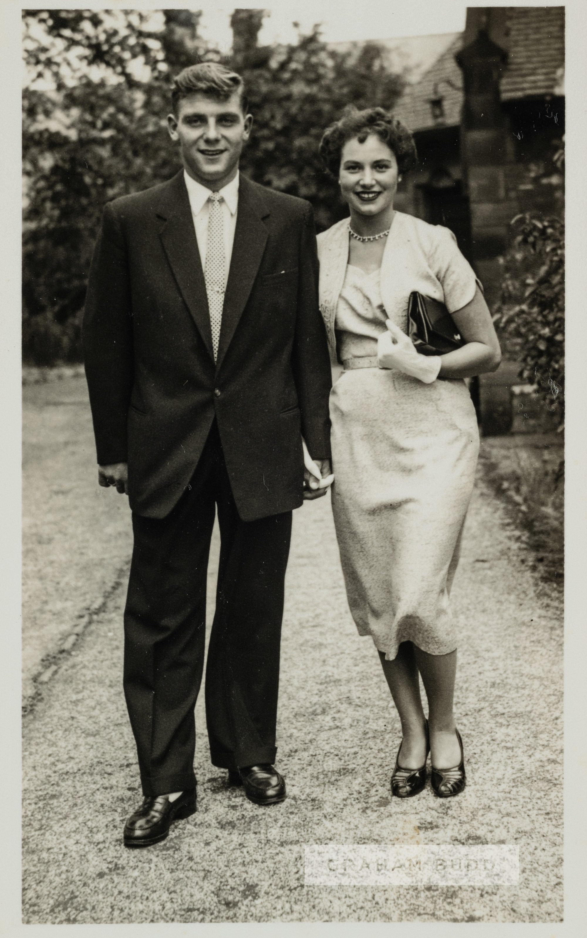 A privately taken photograph of the Duncan Edwards of Manchester United and England and his fiancée Molly Leech, circa 1957, b & w 13.5 by 8.5cm photograph, the couple very smartly dressed perhaps at a wedding or other formal occasion Lots 669 to 710 Provenance: The Molly Leech Collection. Fiancée to Duncan Edwards of Manchester United and England. Thence by family descent.