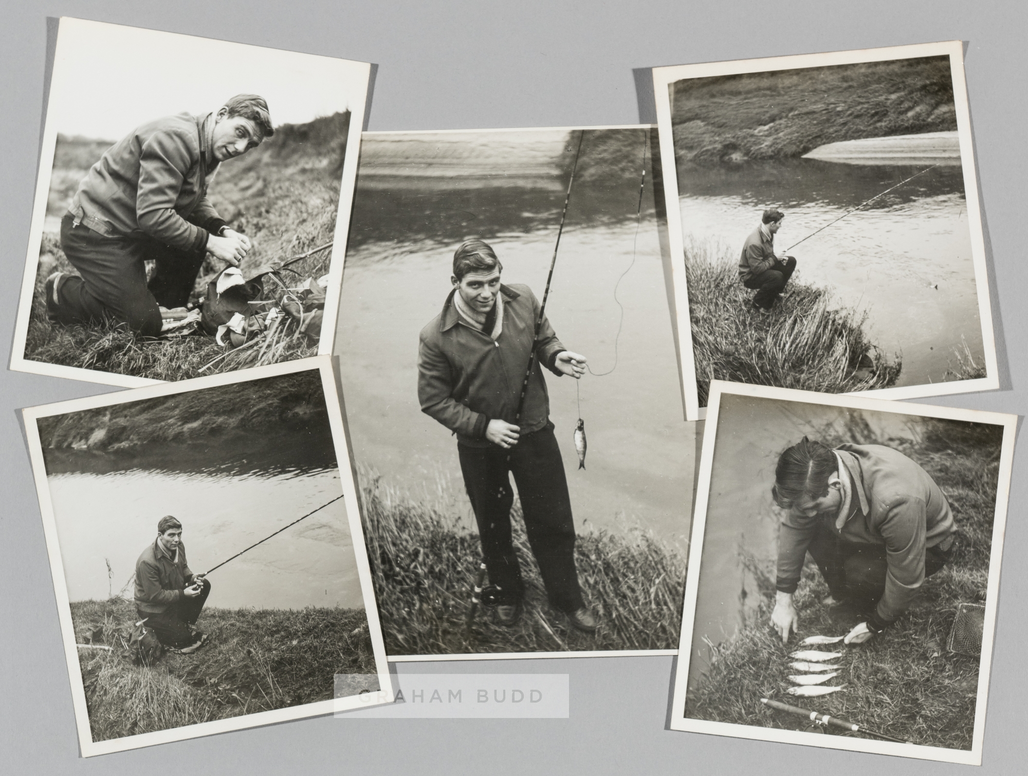 A group of five photographs featuring Duncan Edwards of Manchester United and England spending a relaxing day fishing, b & w, various sizes the largest 8 by 6in., good condition, (5) Lots 669 to 710 Provenance: The Molly Leech Collection. Fiancée to Duncan Edwards of Manchester United and England. Thence by family descent.