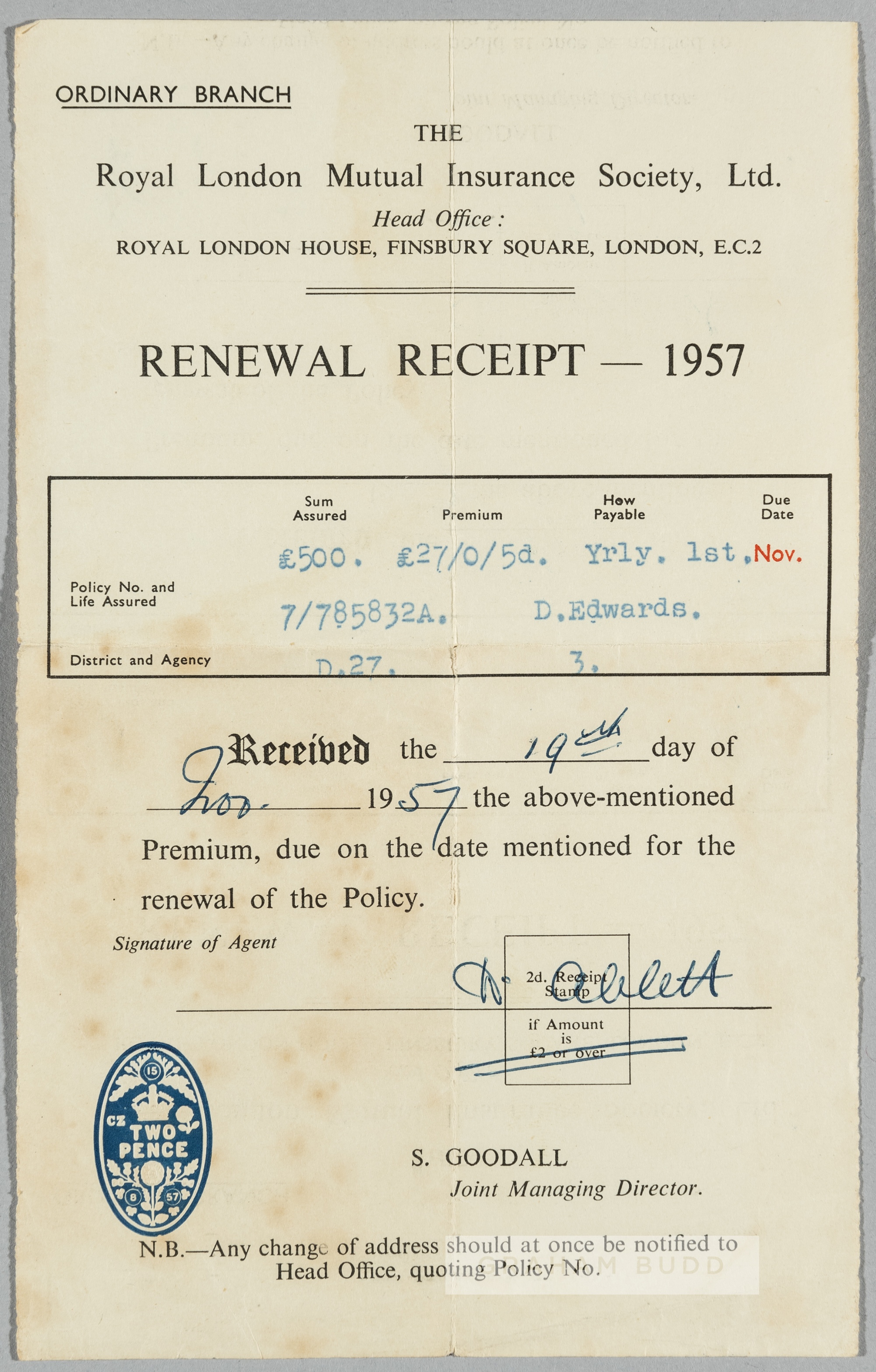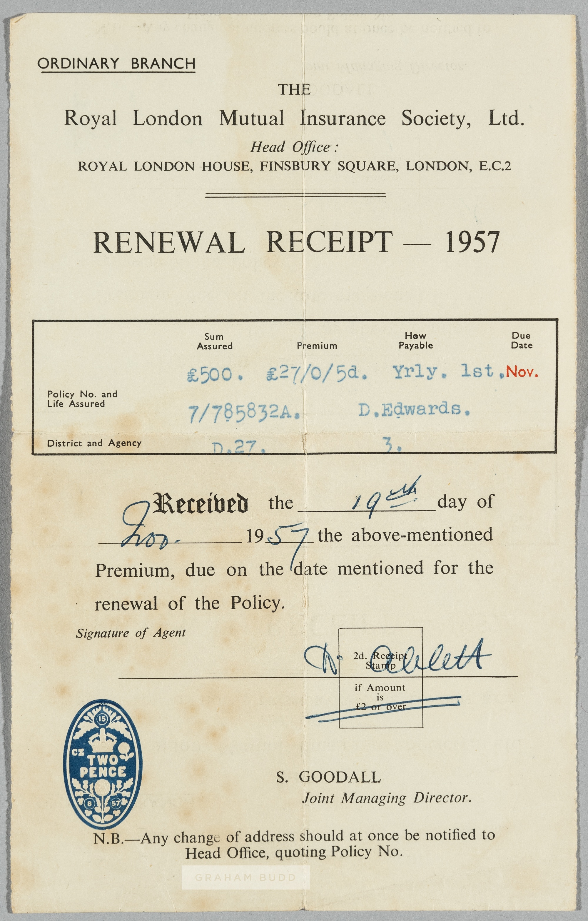 A renewal receipt for a life assurance policy taken out by the Manchester United footballer Duncan Edwards on 19th November 1957, three months before his tragic death at the Munich Air Disaster, the policy issued by the Royal London Mutual Insurance Society, the some assured £500 for a yearly premium of twenty seven pounds no shillings and five pence, signed by the insurance agent Lots 669 to 710 Provenance: The Molly Leech Collection. Fiancée to Duncan Edwards of Manchester United and England. Thence by family descent.
