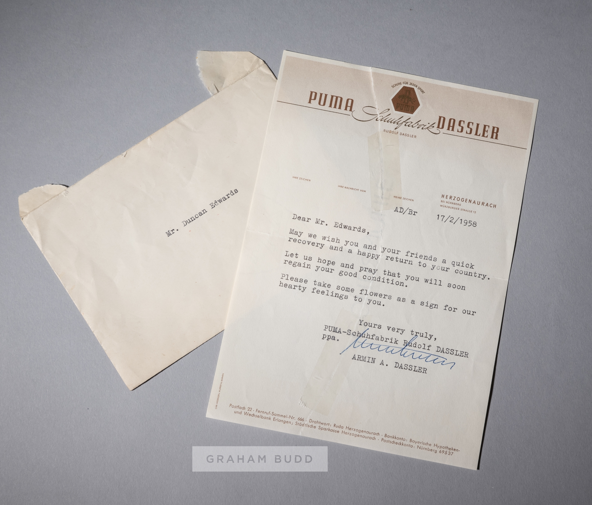 A signed typescript letter from Rudolf Dassler founder of Puma sportswear to Duncan Edwards of Manchester United and England footballer, dated 17th February 1958, on Puma letterhead, signed ppa by son Armin A. Dassler on behalf of his father 'Rudi' and wishing Duncan and his friends a quick recovery and happy return to their country, further stating "lets us hope and pray that you will soon regain your good condition. Please take some flowers as a sign of our hearty feelings towards you." complete with original envelope, this having been sent to the Krankenhaur hospital, rechts der Isar, Munich The following lot is a letter from Rudi's brother Adi Dassler, the founder of Adidas sportswear. Lots 669 to 710 Provenance: The Molly Leech Collection. Fiancée to Duncan Edwards of Manchester United and England. Thence by family descent.