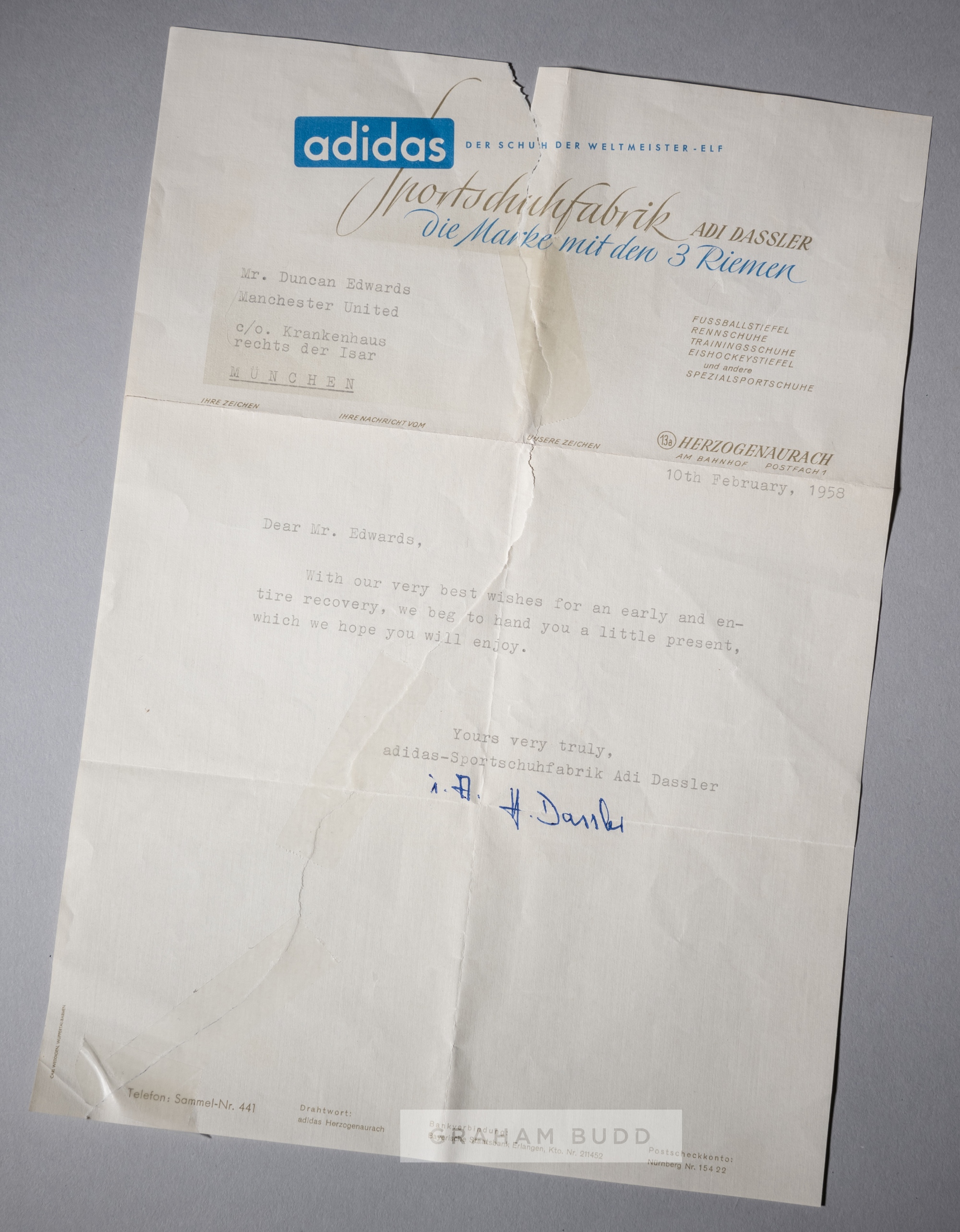 A signed typescript letter from Adi Dassler founder of Adidas sportswear to Duncan Edwards of Manchester United and England footballer, dated 10th February 1958, on Adidas letterhead addressed to the Krankenhaur hospital, rechts der Isar, Munich and reading "Dear Mr Edwards, with our very best wishes for an early and entire recovery, we beg to hand you a little present, which we hope you will enjoy, your very truly Adi Dasler", complete with original envelope and also containing an envelope for Munich 1860 Football Club, letter bears tear and paper loss with tape repair The previous lot is a letter from Adi's brother Rudi Dassler, the founder of Puma sportswear. Lots 669 to 710 Provenance: The Molly Leech Collection. Fiancée to Duncan Edwards of Manchester United and England. Thence by family descent.