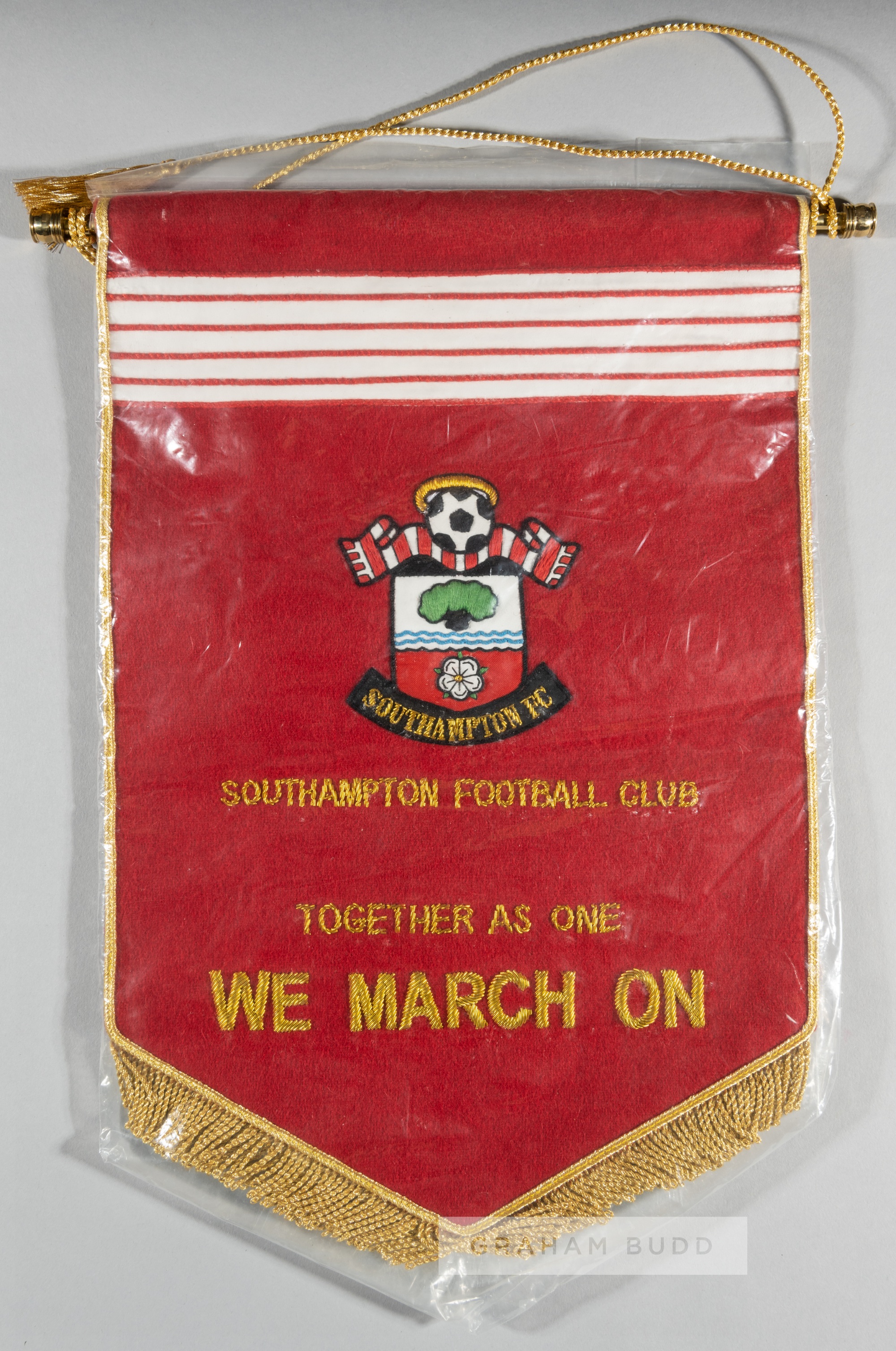 Three official match balls, comprising two Mitre official Nationwide EFL footballs, a yellow, navy and red ball with OFFICIAL MATCHBALL OF THE NATIONWIDE FOOTBALL LEAGUE and NATIONWIDE FOOTBALL LEAGUE logo and a silver, black and gold ball with OFFICIAL MATCHBALL OF THE CARLING CUP and CARLING CUP logo; sold with an Umbro orange, black and blue football with THE FA CUP E-ON logo; the lot also including a Southampton FC match day pennant, red, white with gold braid and tassels, embroidered club crest and SOUTHAMPTON FOOTBALL CLUB TOGETHER AS ONE WE MARCH ON, with hanging pole and braid, 37 by 30cm. (4)