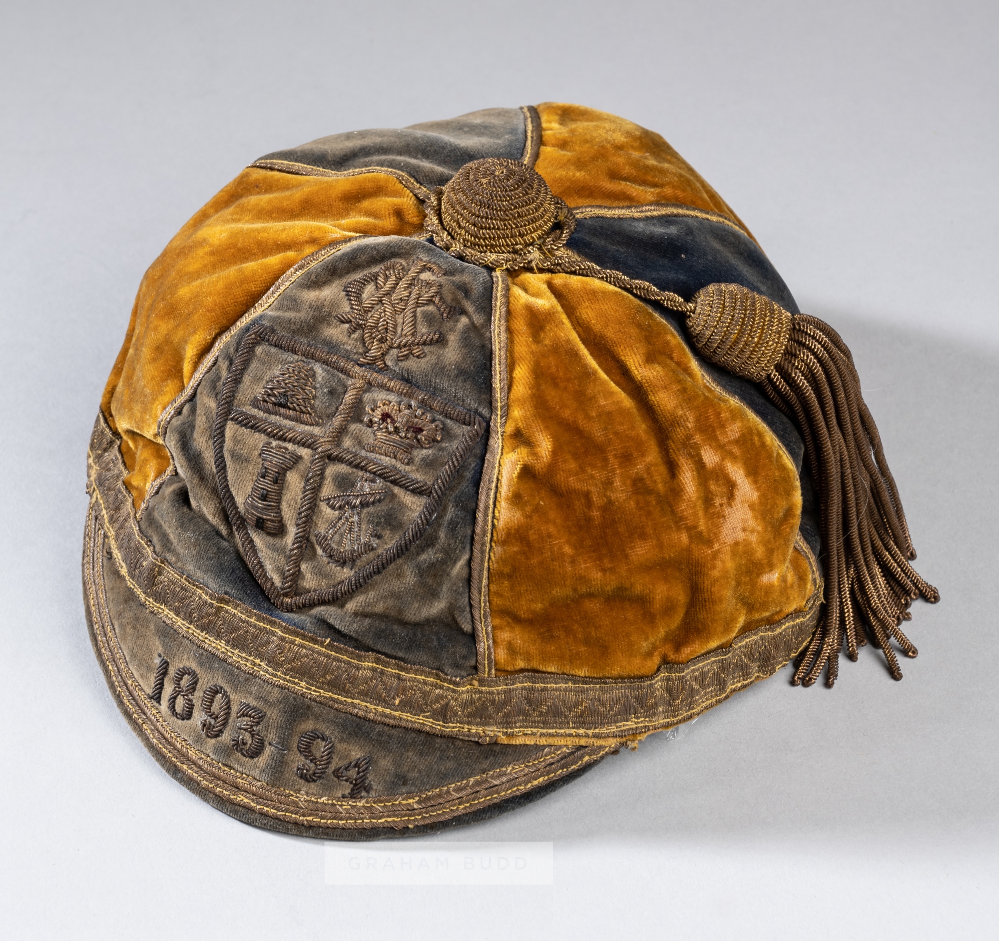 Westmorland County representative cap, 1893-94, gold and navy velvet cap with gilt tassel and braiding, embroidered with entwined letters CFA above a shield with a beehive, crown, tower and ship, 1895-94, interior with makers label J WRIGHT 33 WESTMORELAND ST., bears wear to velvet and braiding, faded