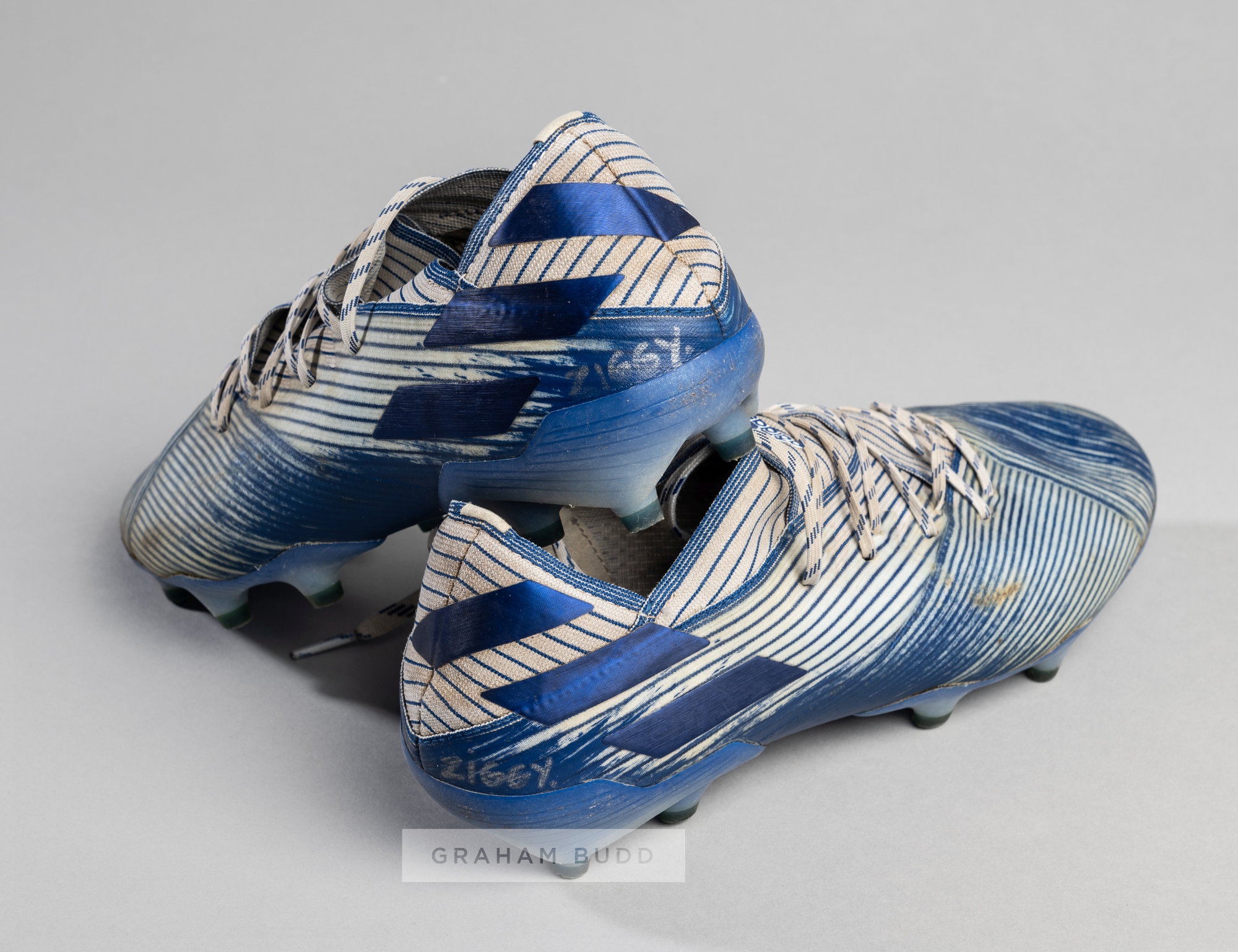 Portsmouth's Ryan Williams signed worn Adidas Nemesis football boots, the blue and white boots signed 'ZIGGY' on the boot heals, dedicated to his son