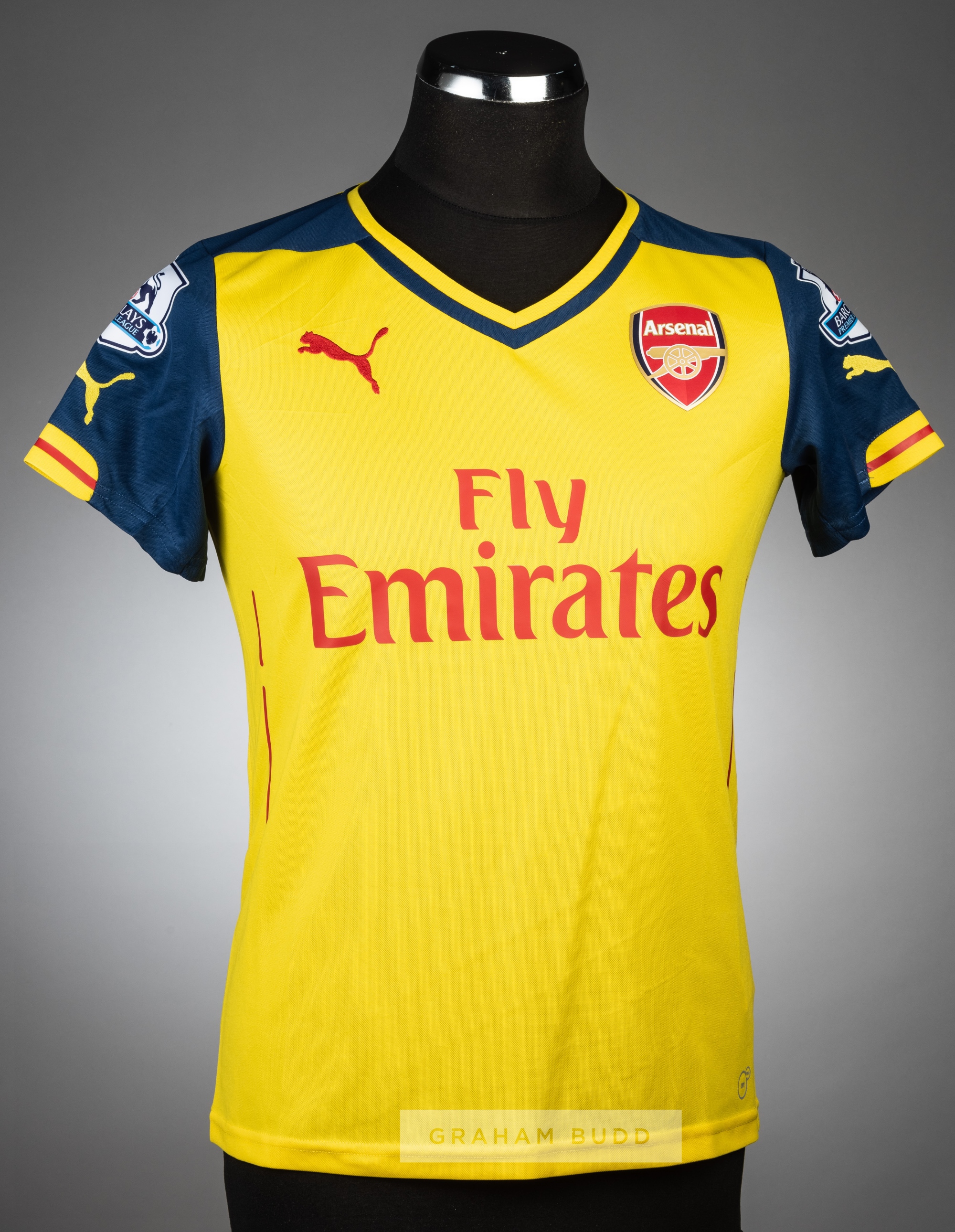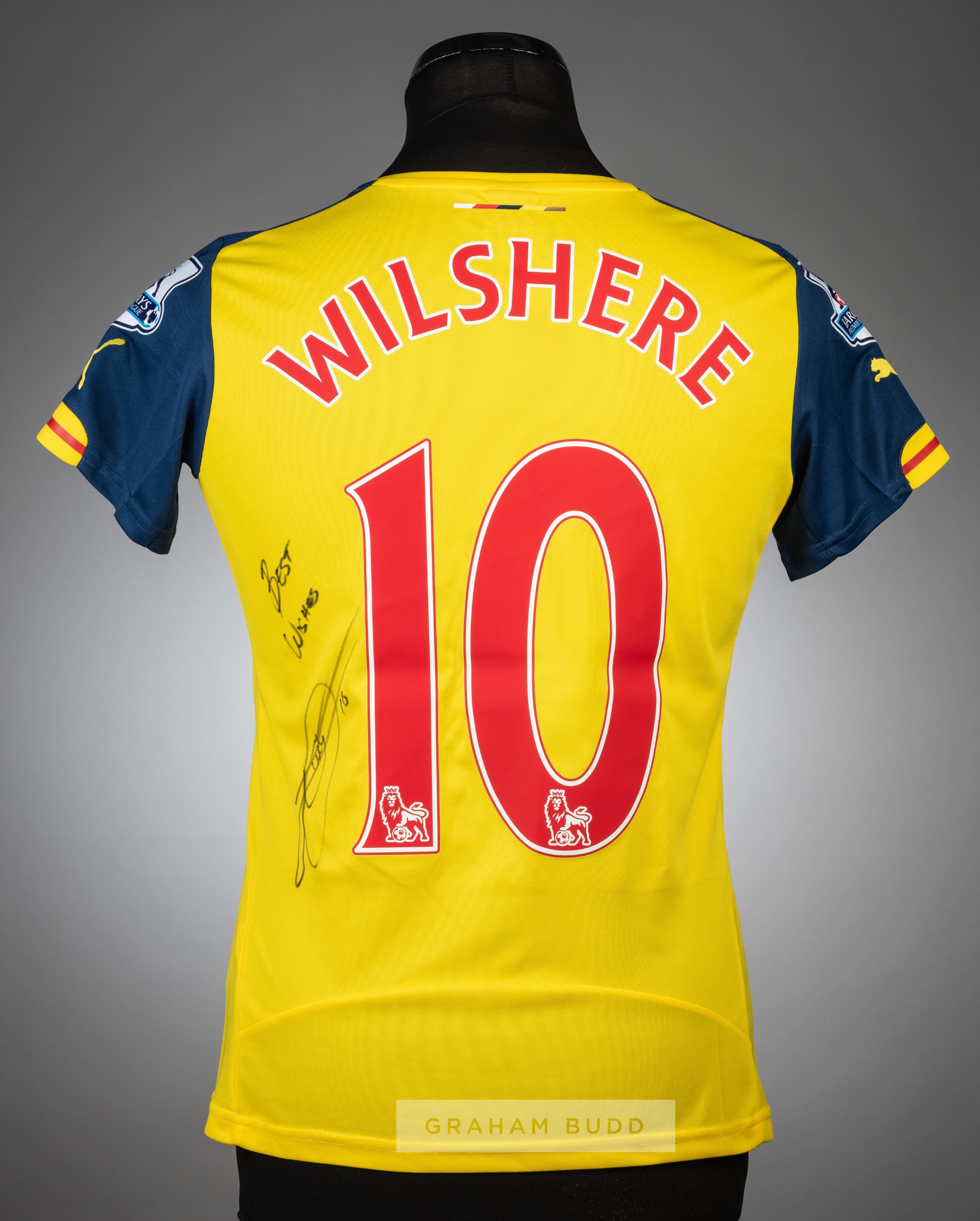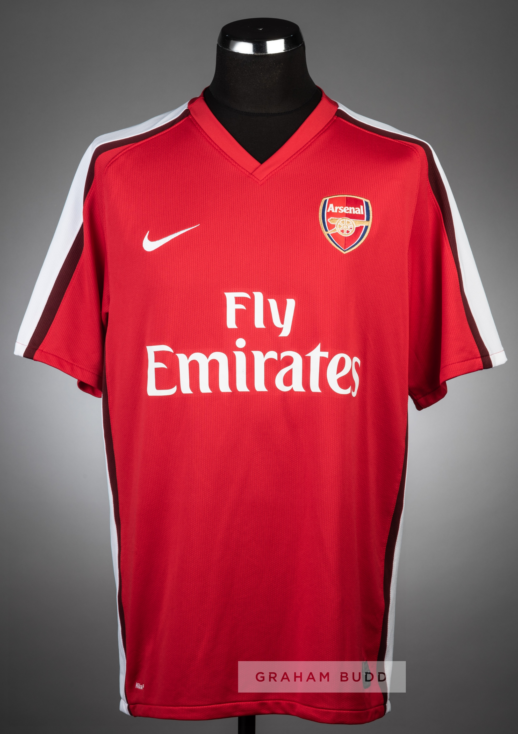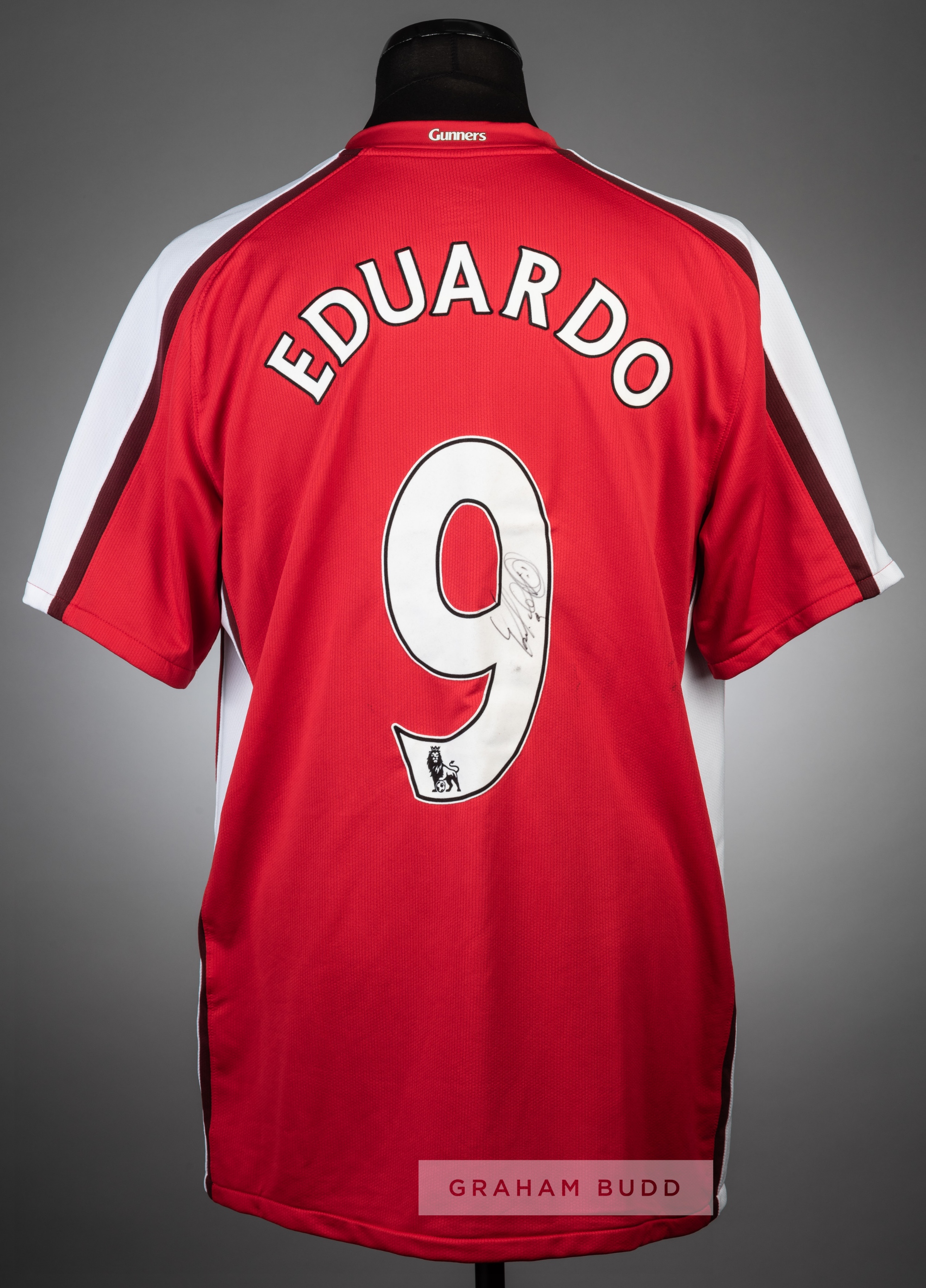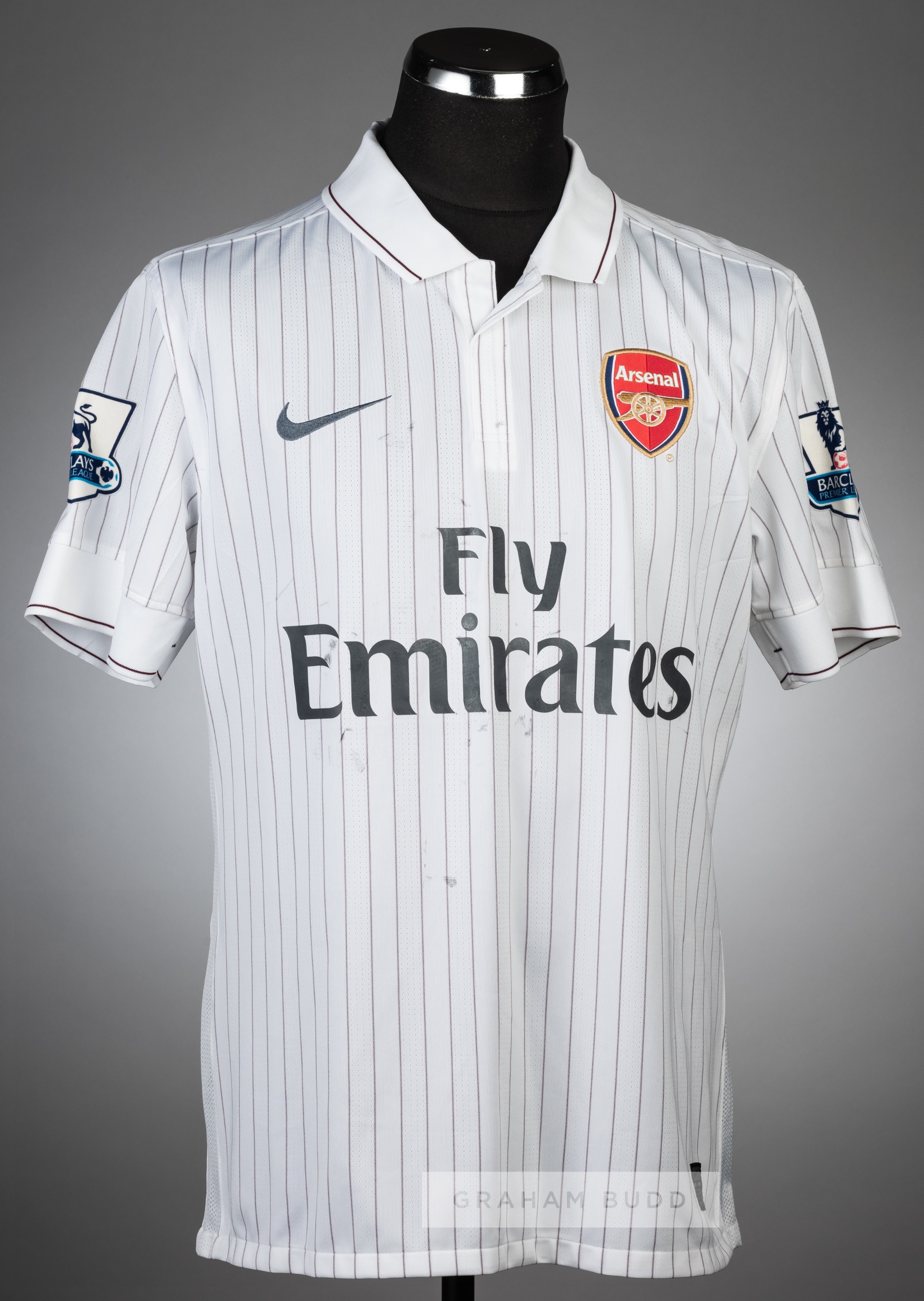 Three Arsenal jersey's, season's 2008-09, 2009-10 and 2014-15, comprising Emmanuel Eboue signed white and claret pinstripe Arsenal no.27 third choice jersey, season 2009-10, Nike, short-sleeved with BARCLAYS PREMIER LEAGUE sleeve badges, club crest and sponsor logo, reverse lettered EBOUE, signed in black marker pen to reverse, FLY EMIRATES lettering on the front is tacky and has transposed onto the jersey, hence bears black marks on the front and reverse; Eduardo da Silva signed red and white Arsenal no.9 home jersey, season 2008-09, Nike, short-sleeved with club crest and sponsor logo, reverse lettered EDUARDO, signed in black marker pen to number nine on reverse and Jack Wilshere signed yellow and navy Arsenal no.10 away jersey, season 2014-15, Nike, short-sleeved with BARCLAYS PREMIER LEAGUE sleeve badges, club crest and sponsor logo, reverse lettered WILSHERE, signed in black marker pen to reverse, (3)