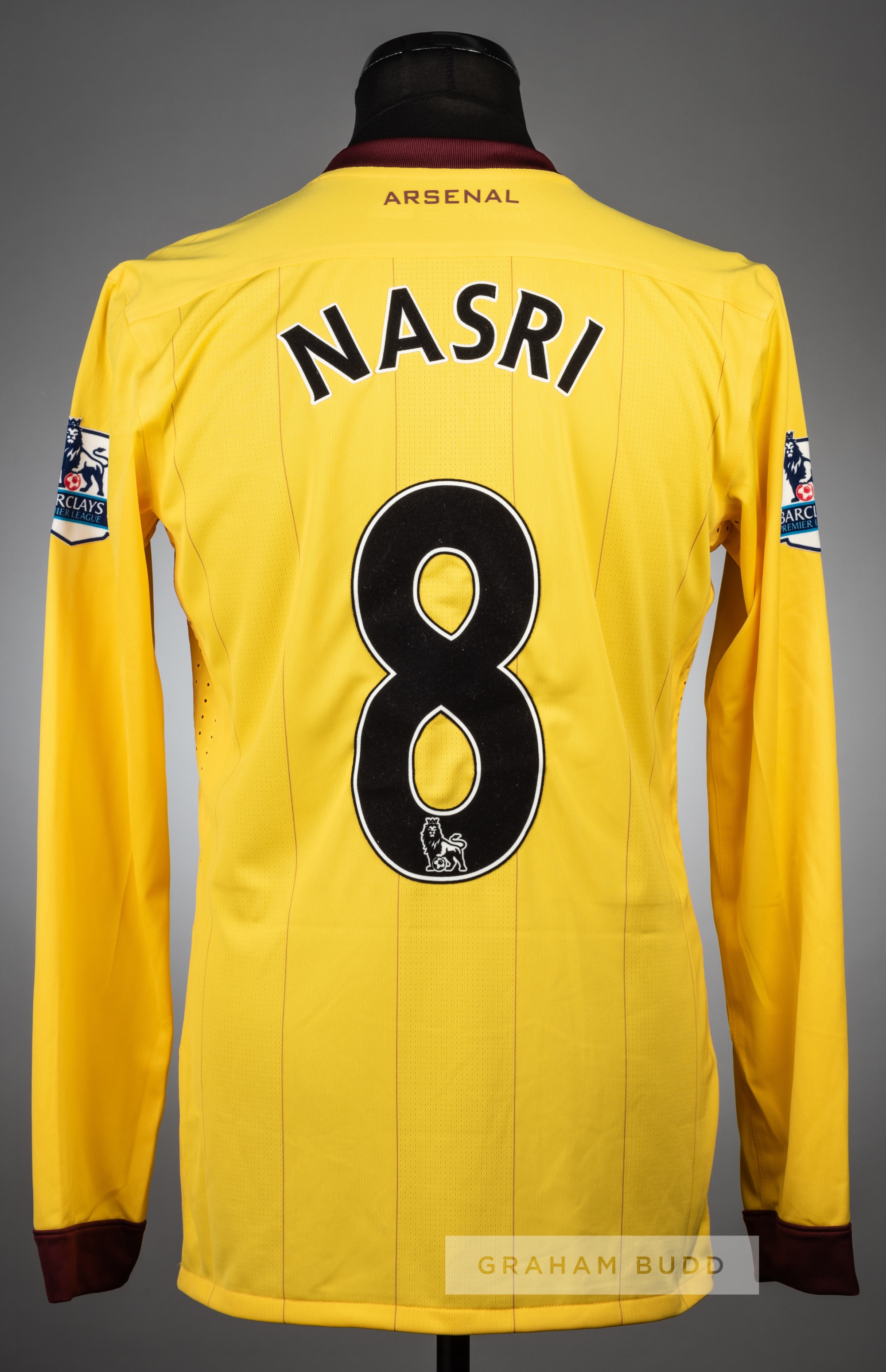Samir Nasri yellow and claret Arsenal Poppy no.8 away jersey v Everton at Goodison Park, 14th November 2010, Nike, long-sleeved with BARCLAYS PREMIER LEAGUE sleeve badges, embroidered red poppy, club crest and sponsor logo, reverse lettered NASRI Arsenal defeated Everton 2-1.