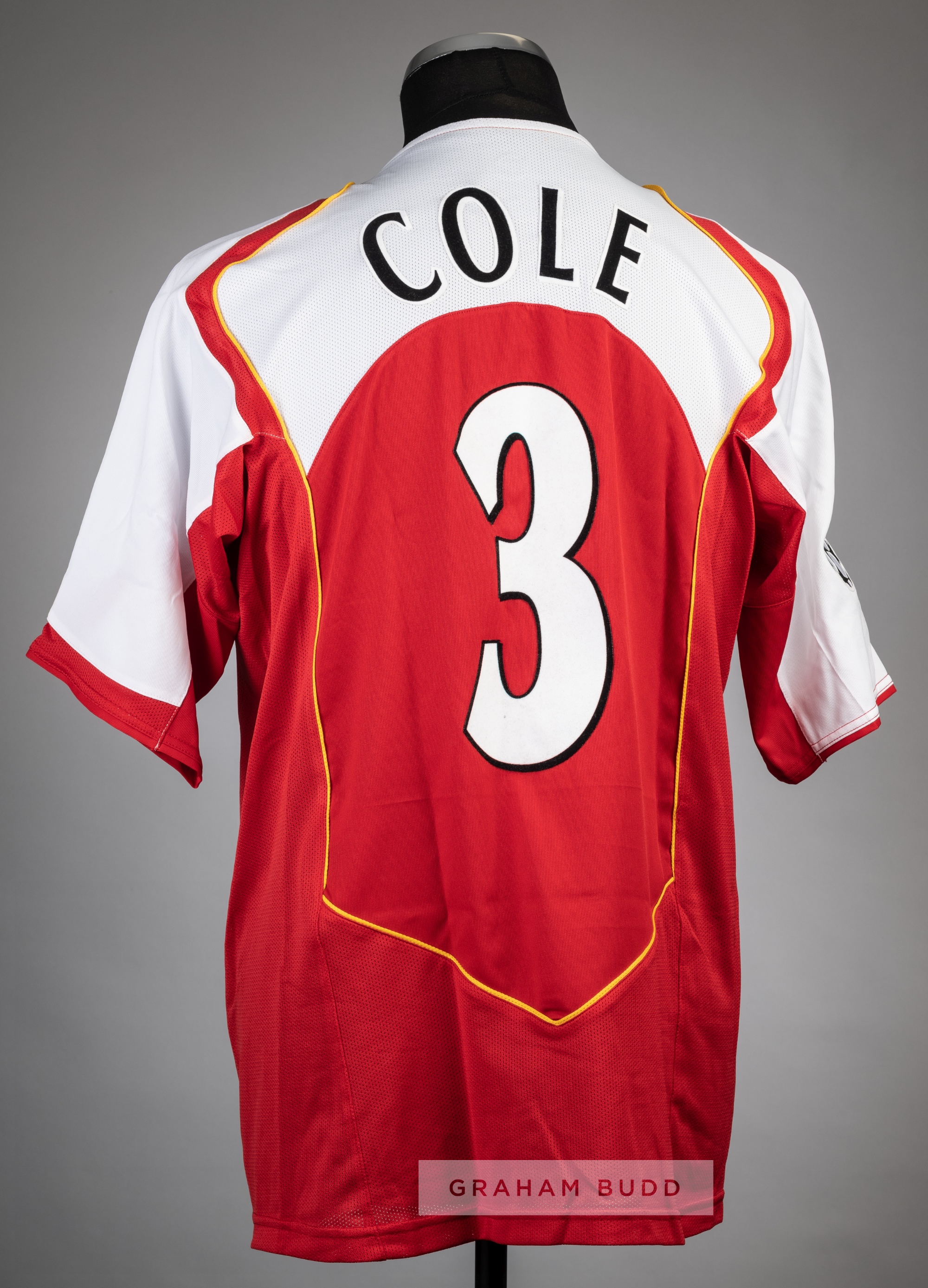 Ashley Cole red Arsenal UEFA Champions League No.3 home jersey v Bayern Munich, played at Highbury, 9th March 2005, Nike, short-sleeved with UEFA STARBALL sleeve badge, club crest and sponsor logo, reverse lettered COLE Arsenal defeated Bayern Munich 1-0 but lost to Bayern Munich 3-2 on aggregate.