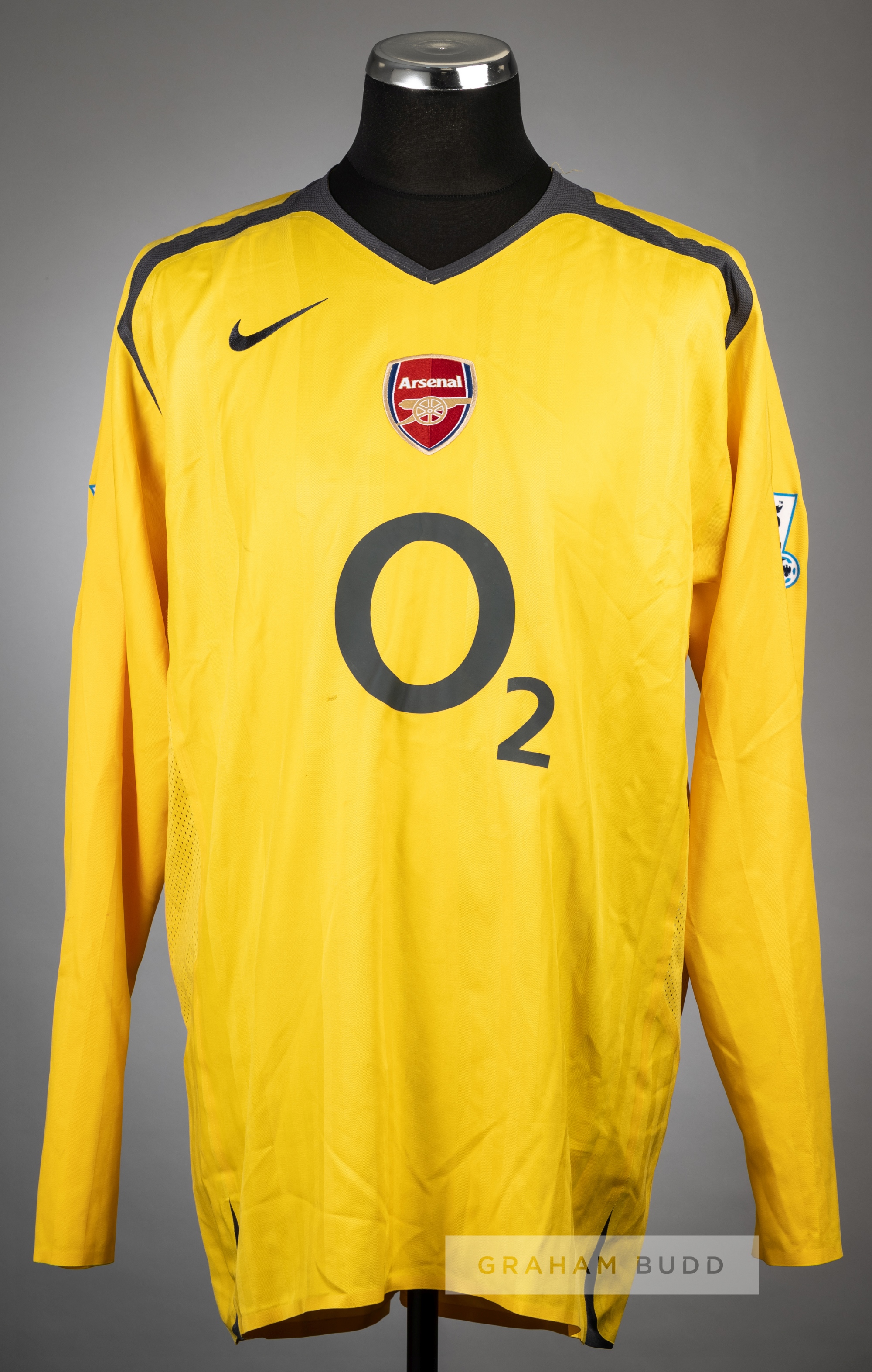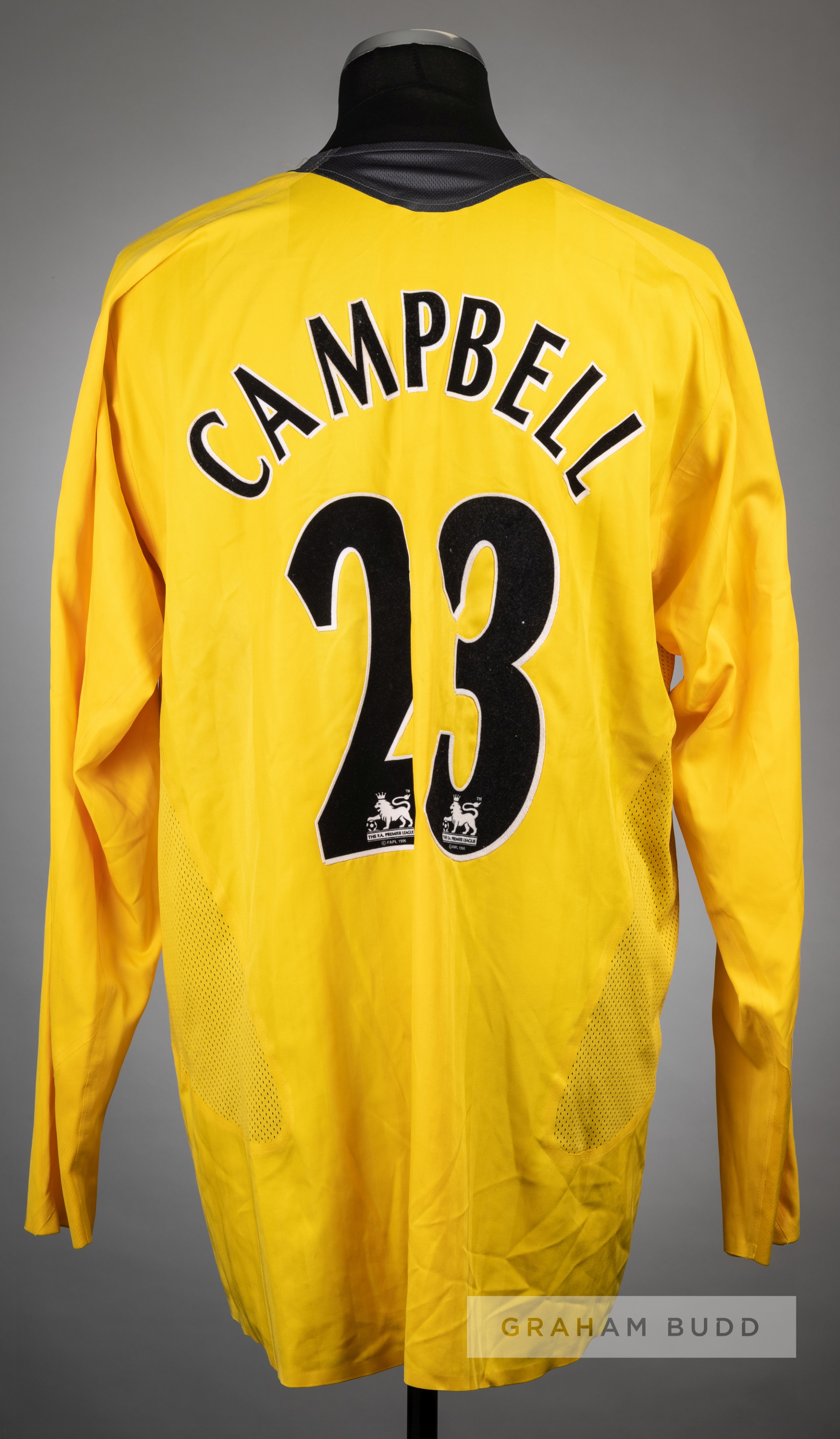 Sol Campbell yellow Arsenal no.23 away jersey, season 2005-06, Nike, long-sleeved with BARCLAYS PREMIERSHIP sleeve badges, club crest and sponsor logo, reverse lettered CAMPBELL
