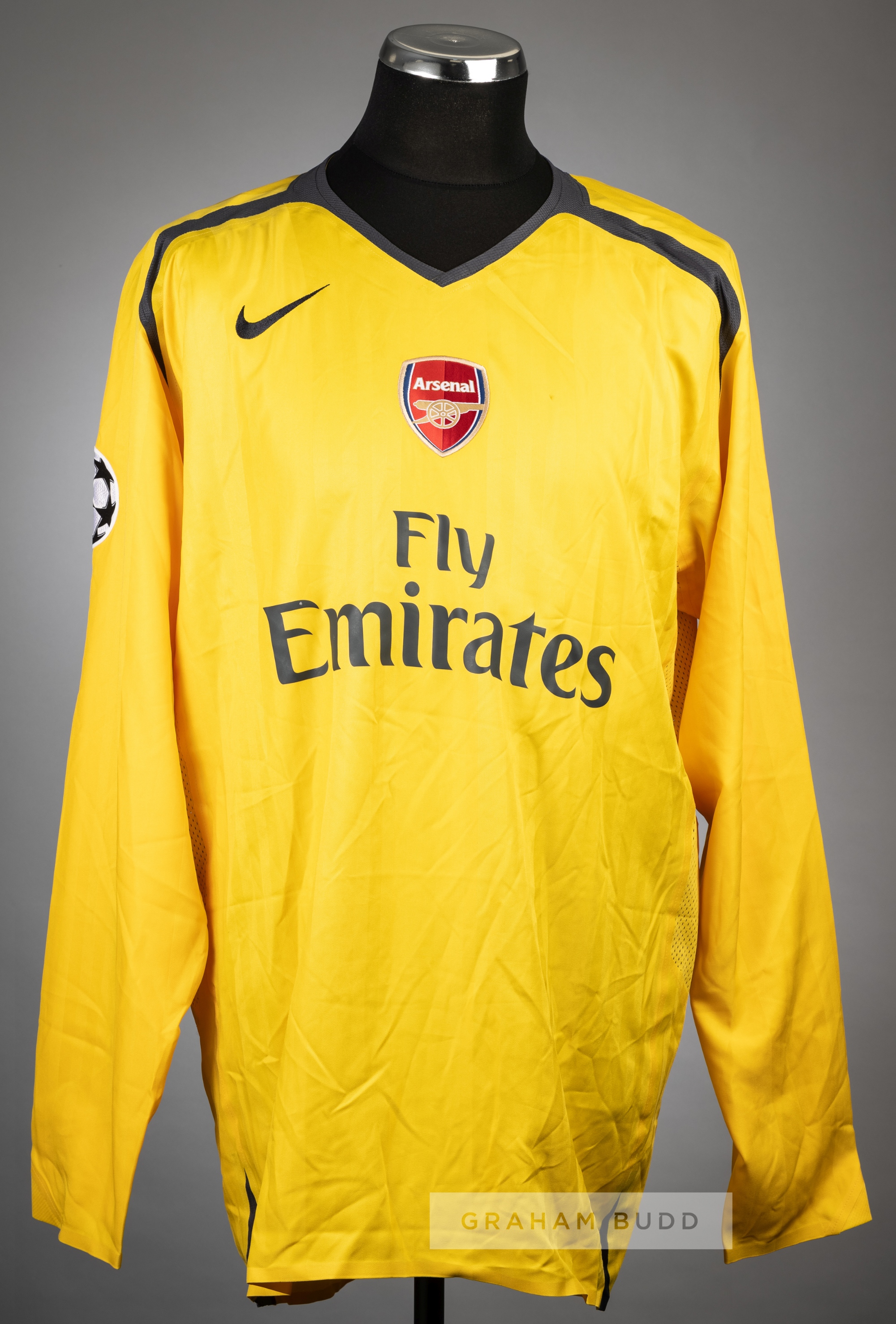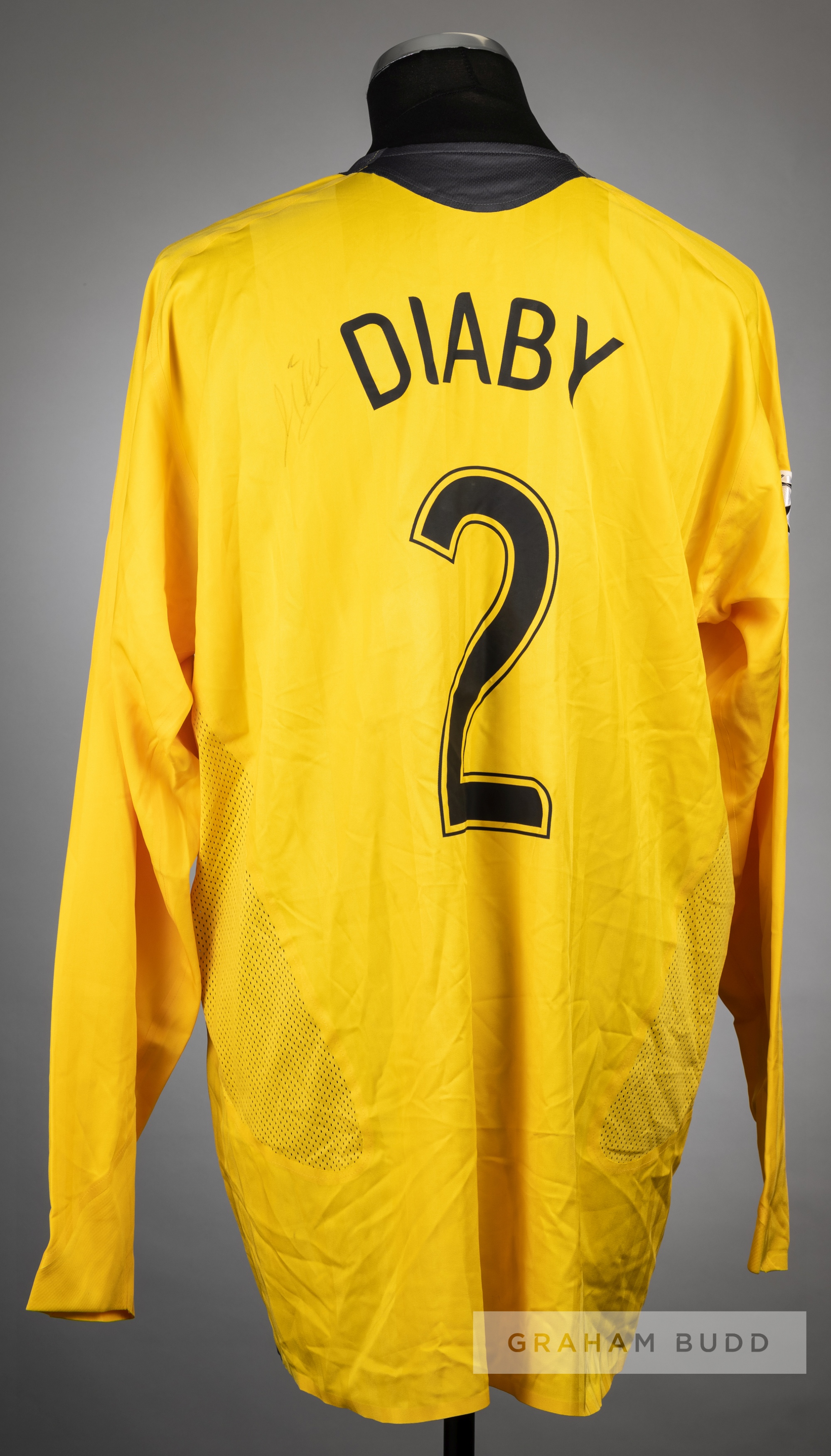Abou Diaby signed yellow Arsenal UEFA Champions League no.2 away jersey, season 2006-07, Nike, long-sleeved with UEFA STARBALL sleeve badge, club crest and sponsor logo, reverse lettered DIABY, faintly signed in black marker pen to reverse
