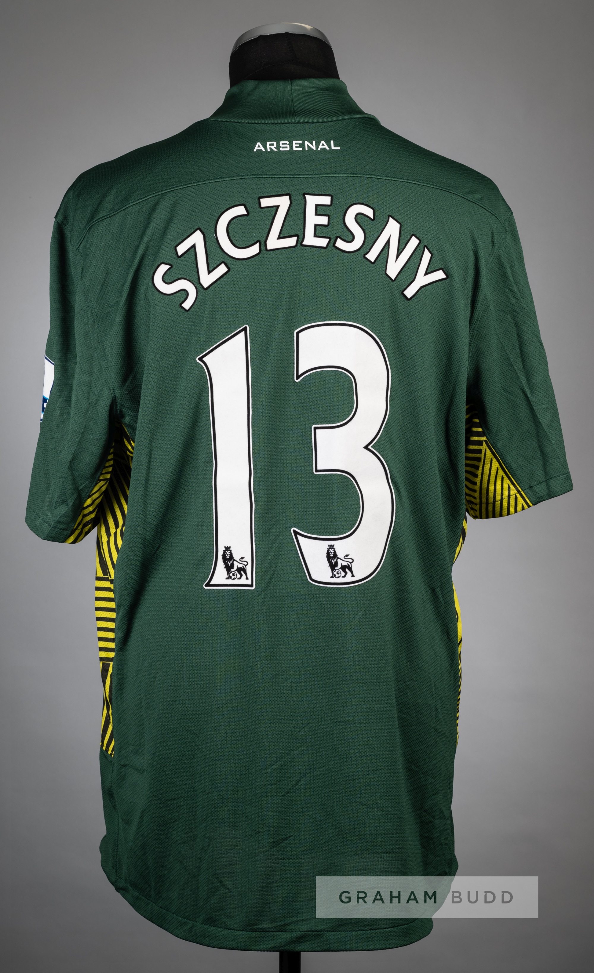 Wojciech Szczesny green Arsenal No.13 goalkeeper's poppy jersey v West Bromwich Albion played at Emirates Stadium, 5th November 2011, Nike, short-sleeved with BARCLAYS PREMIER LEAGUE sleeve badges, embroidered with a red poppy and ARSENAL REMEMBERS ARSENAL V WEST BROMWICH ALBION 5TH NOVEMBER 2011, club crest and sponsor logo, reverse lettered SZCZESNY Arsenal defeated West Bromwich Albion 3-0.