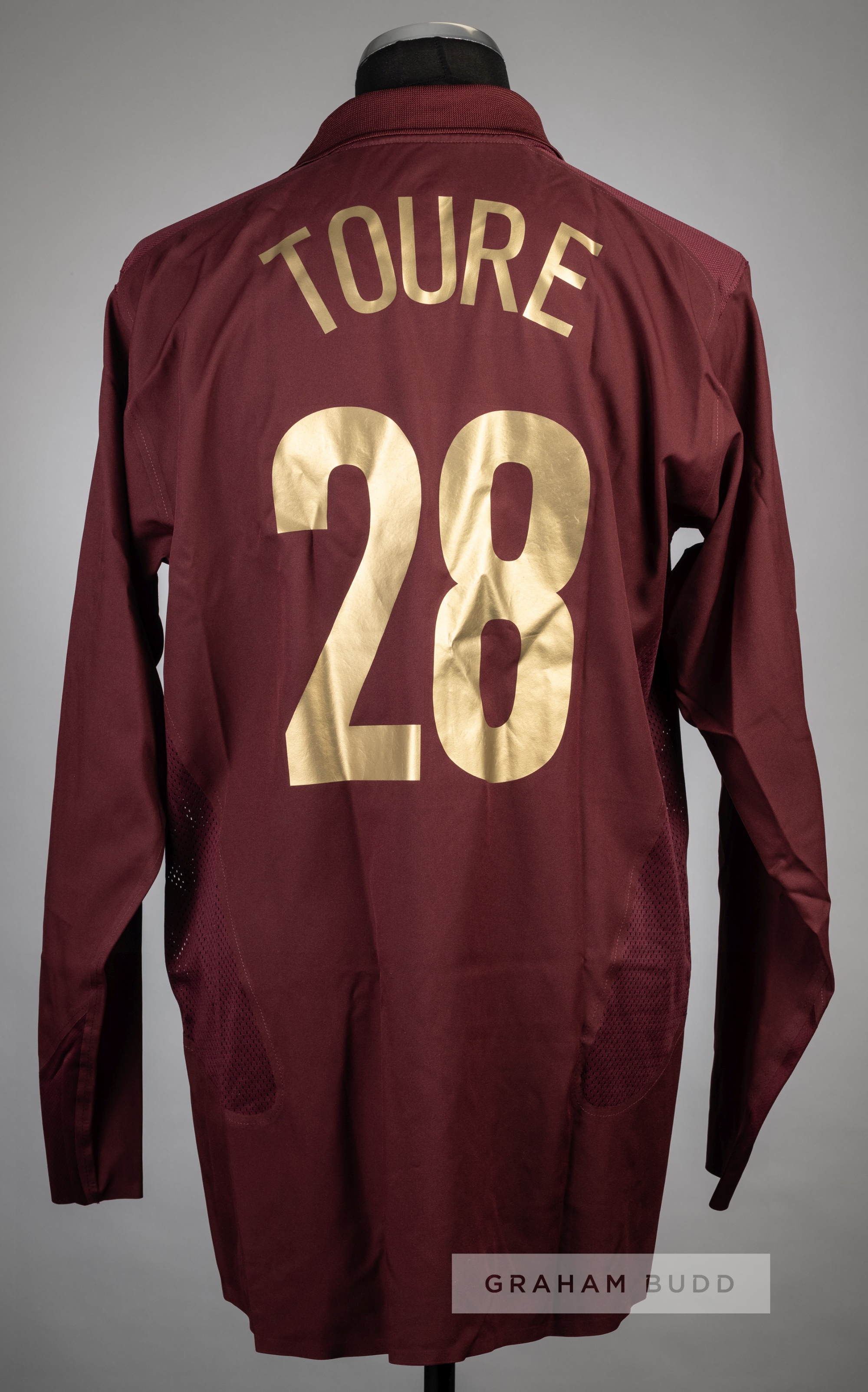 Kolo Toure redcurrant Arsenal no.28 UEFA Champions League jersey v Juventus, season 2005-06, Nike, long-sleeved with UEFA STARBALL sleeve badge, club crest and sponsor logo, reverse lettered TOURE