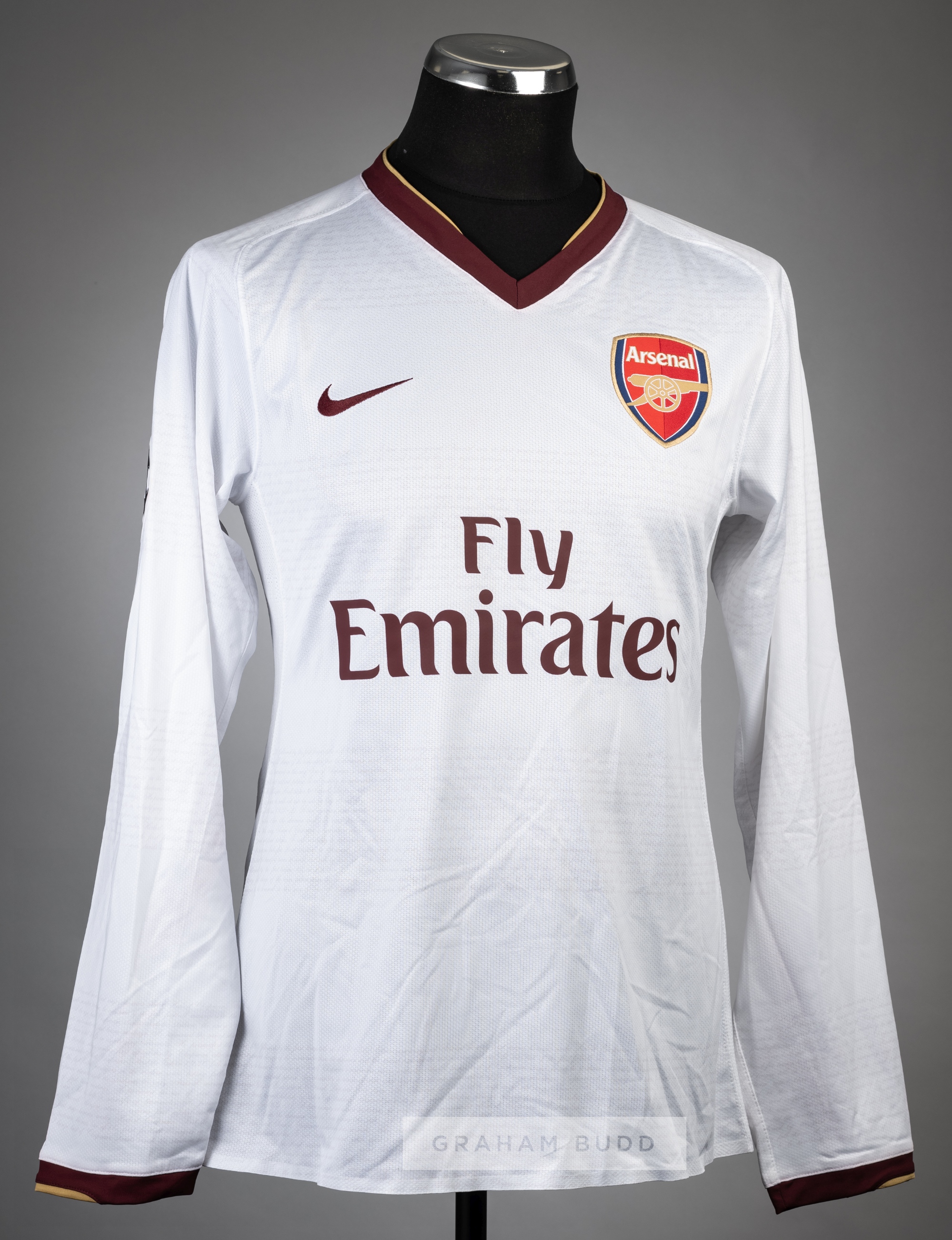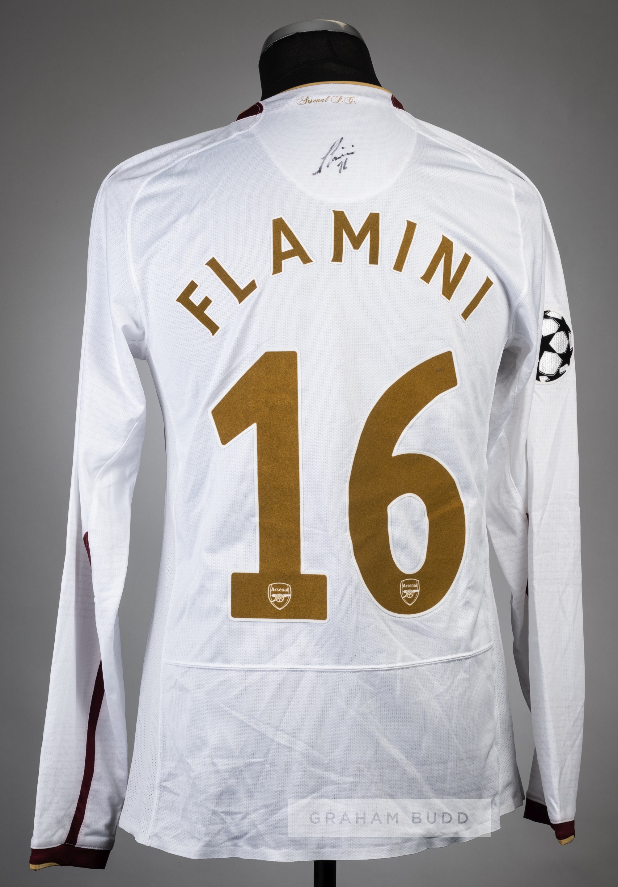 Mathieu Flamini signed white Arsenal UEFA Champions League no.16 jersey v AC Milan, played at the San Siro, 4th March 2008, Nike, long-sleeved with UEFA STARBALL sleeve badge, club crest and sponsor logo, reverse lettered FLAMINI, signed in black marker pen Arsenal defeated AC Milan 2-0.