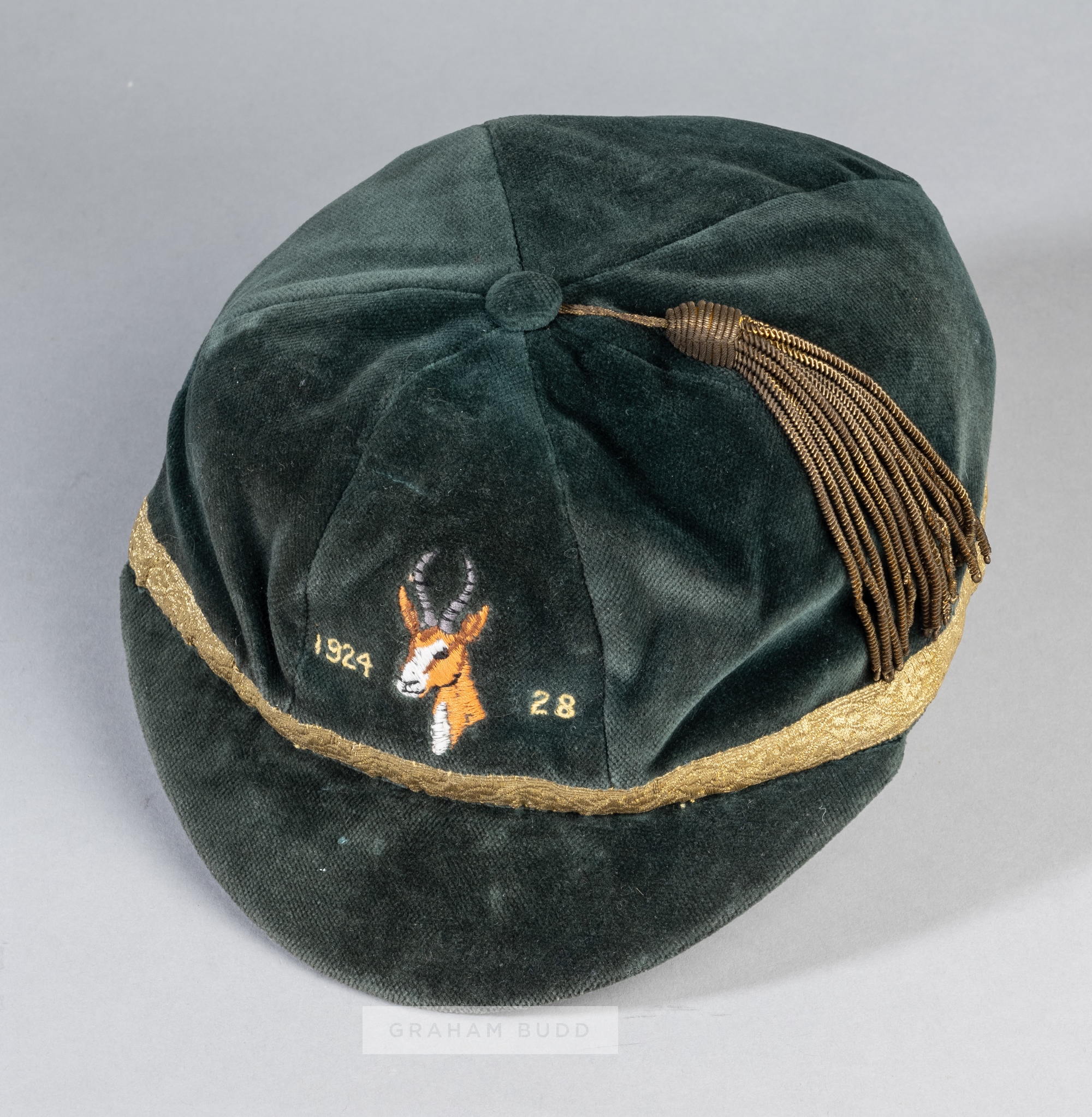 A green rugby representative cap bearing an embroidered springbok's head and dated 1924-28 on the front, with gilt tassel and braiding, the interior
