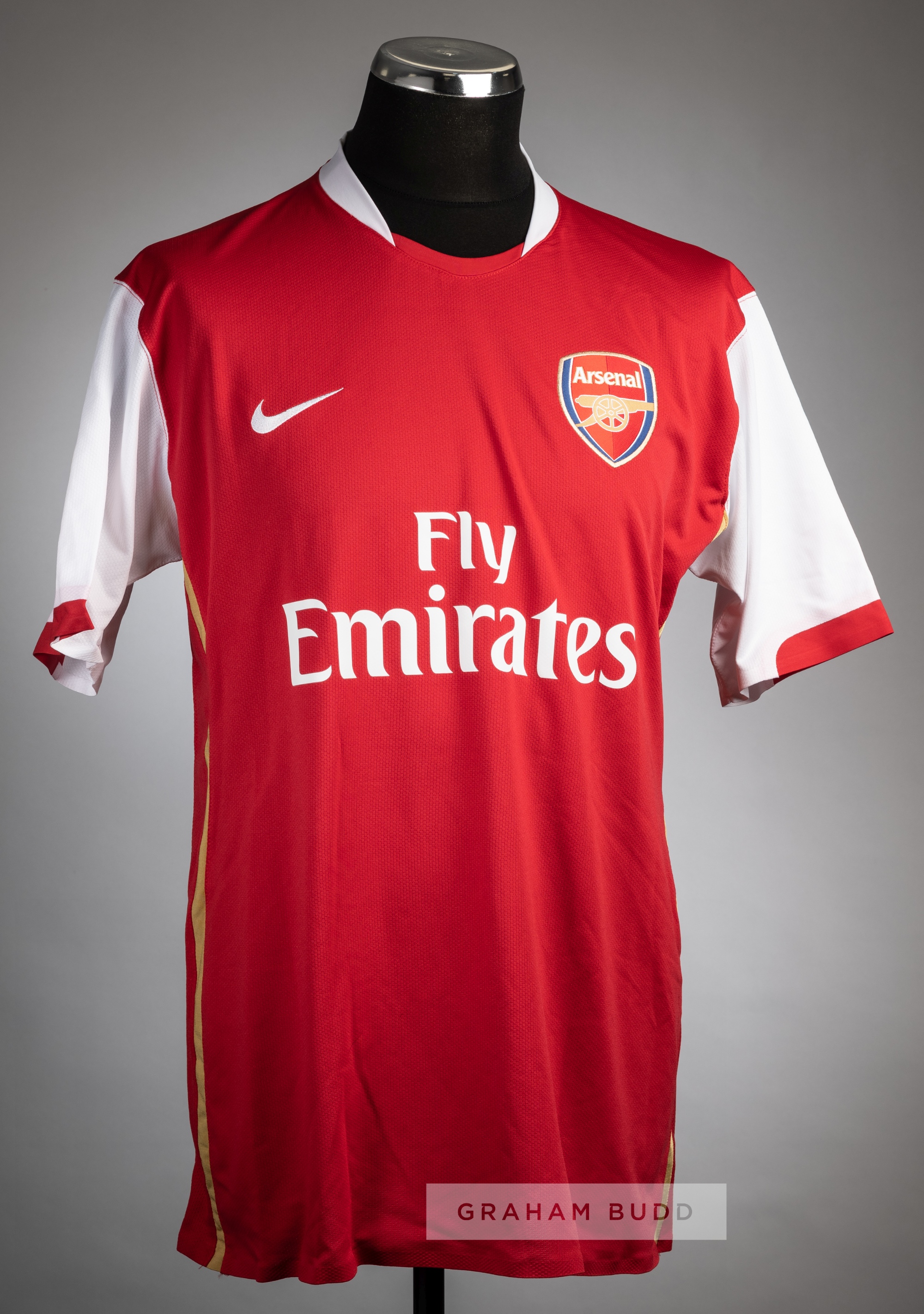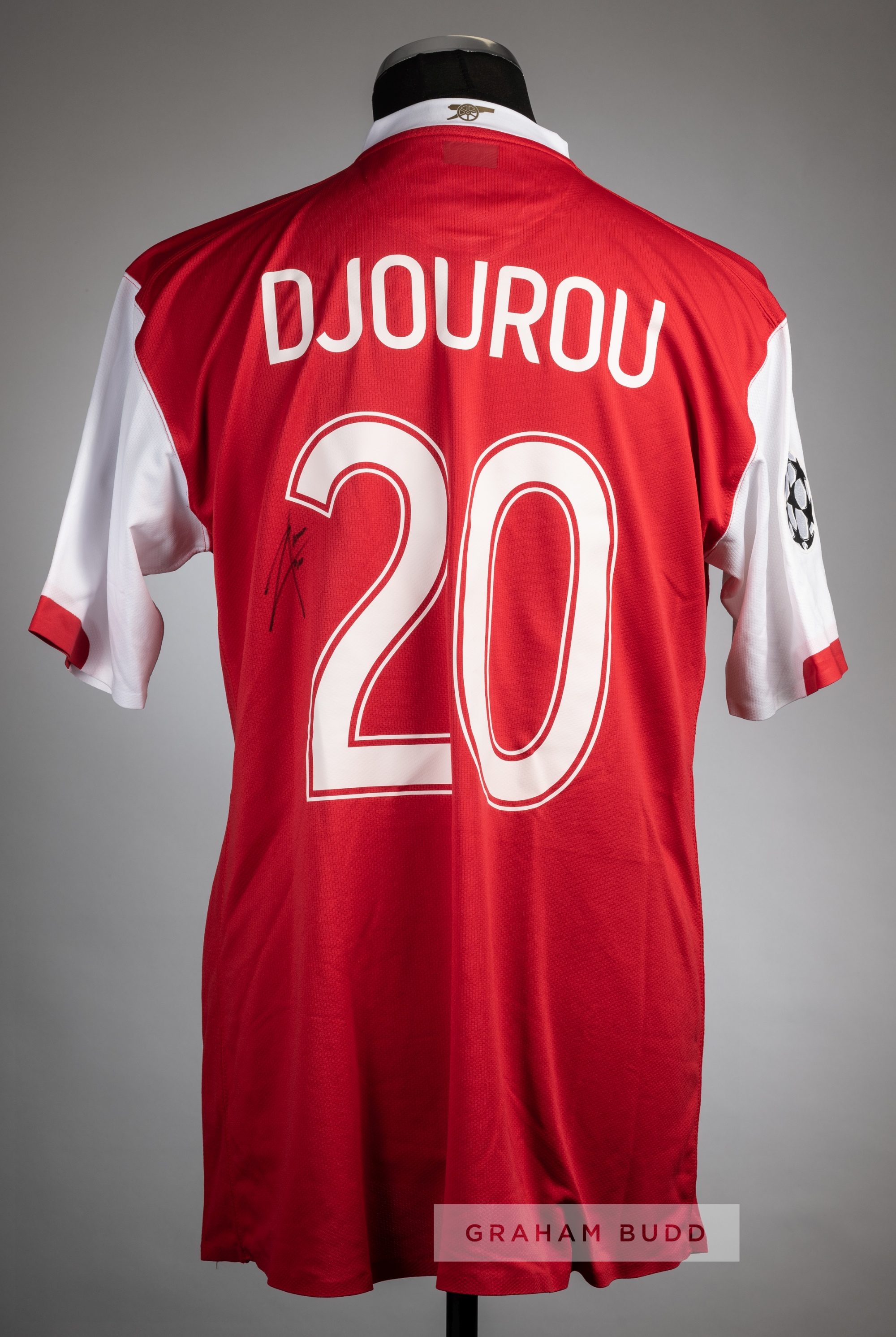Johan Djourou signed red Arsenal No.20 jersey from the UEFA Champions League 3rd Qualifying Round, 1st Leg, v Dinamo Zagreb, played at the Stadion Maksimir, Zagreb 8th August 2006 Nike, short-sleeved with UEFA STARBALL sleeve badges, club crest and sponsor logo, reverse lettered DJOUROU, signed in black marker pen to reverse Arsenal won the match 3-0 and the tie 5-1 on aggregate.