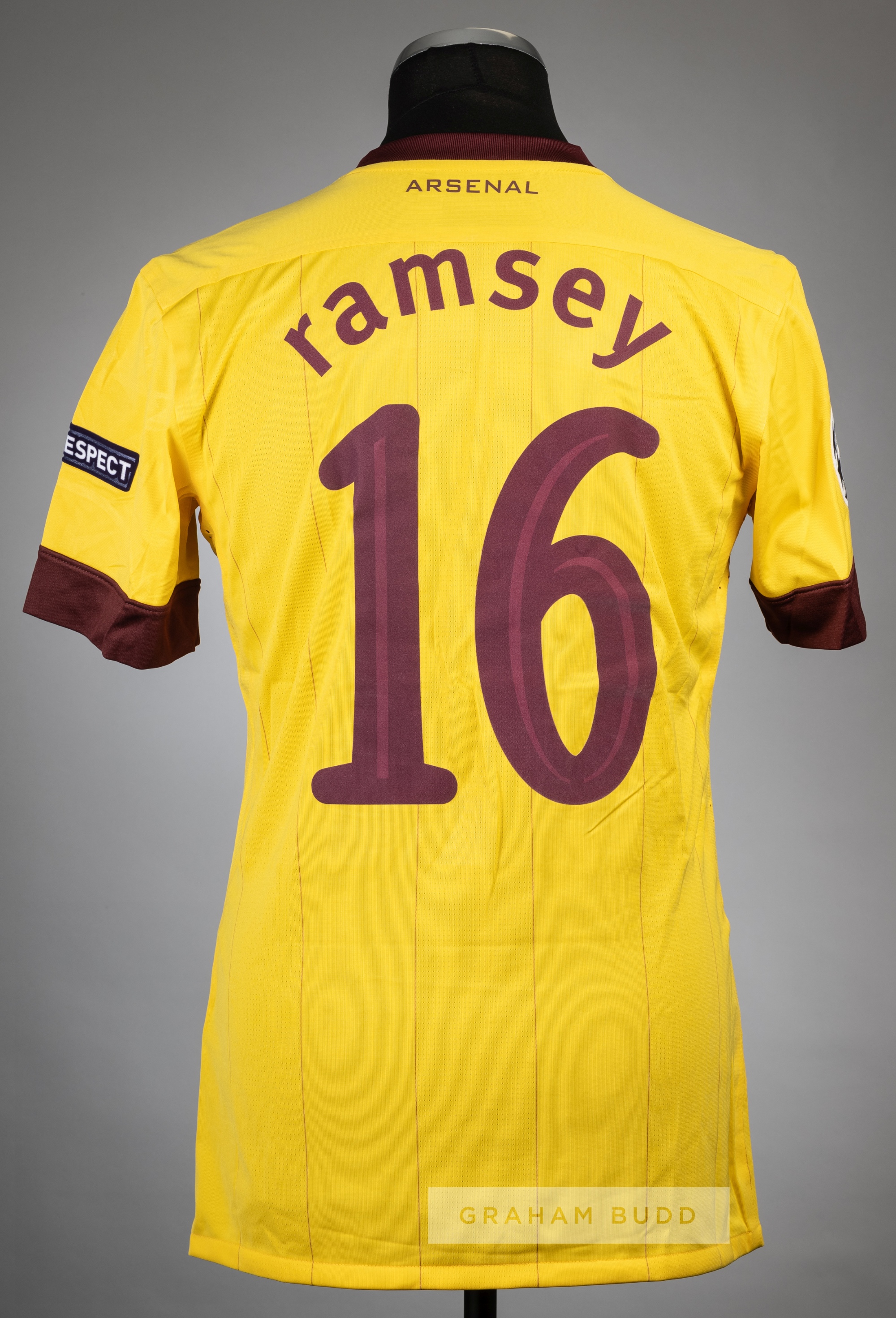 Aaron Ramsey yellow and claret Arsenal UEFA Champions League no.16 jersey, season 2010-11, Nike, short-sleeved with UEFA STARBALL and RESPECT sleeve badges, club crest and sponsor logo, reverse lettered RAMSEY