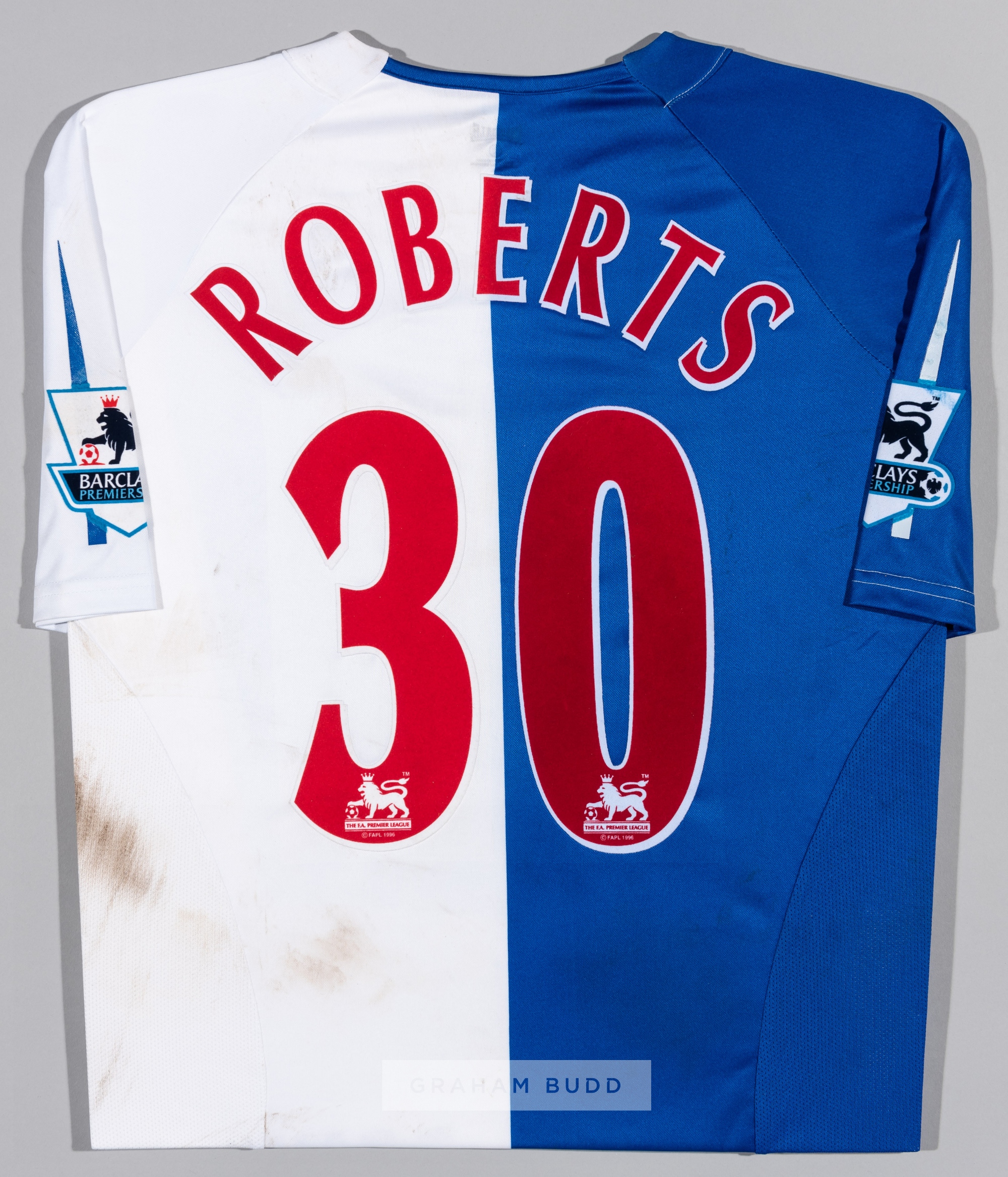Jason Roberts blue and white Blackburn Rovers no.30 home jersey, season 2006-07, short-sleeved with BARCLAYS PREMIERSHIP sleeve badges, club crest and sponsor logo, reverse lettered ROBERTS, signs of pitch dirt, jersey has been mounted in frame, hence jersey bears slight pin holes from mounting