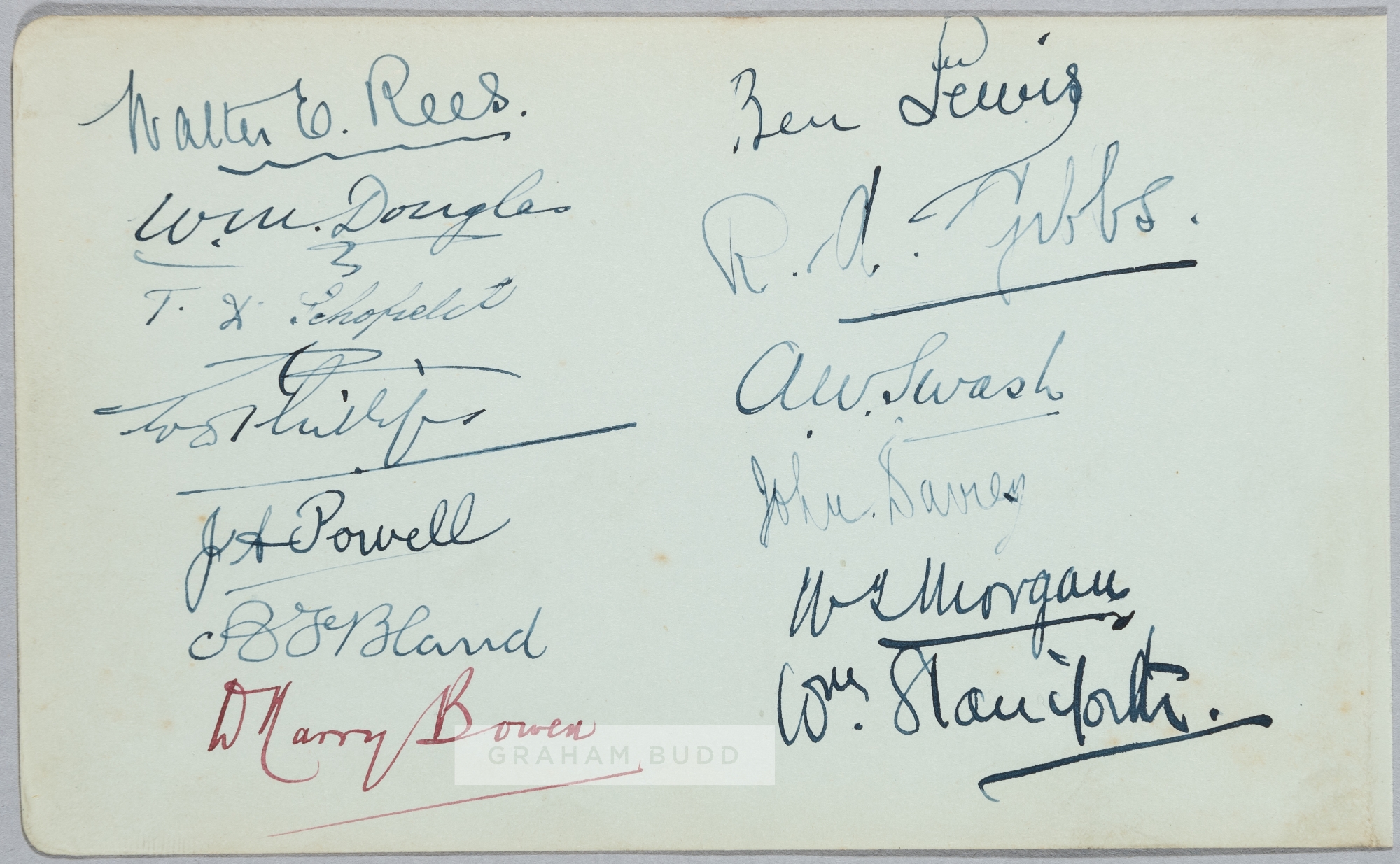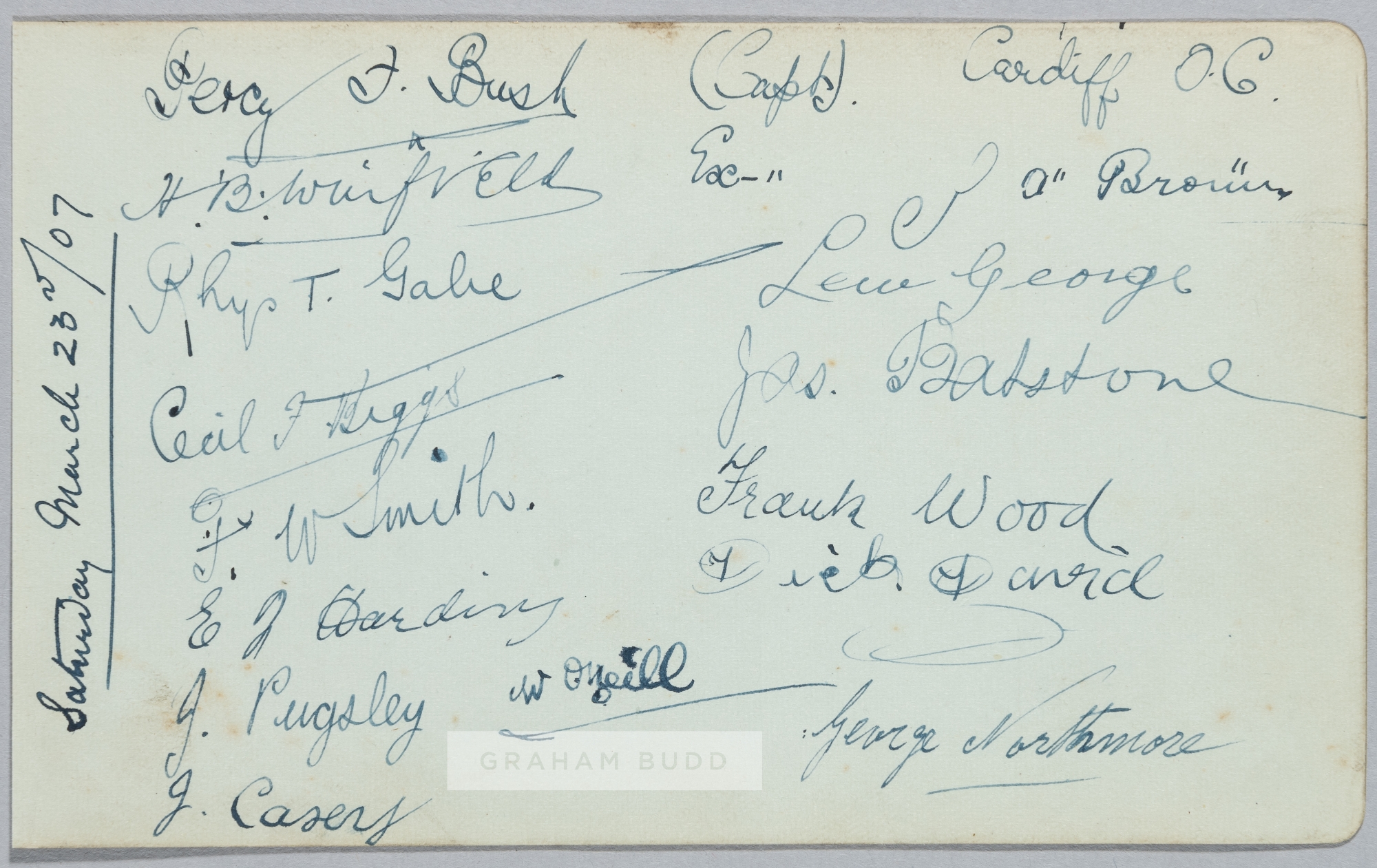 CARDIFF RUGBY FOOTBALL TEAM 1906-07 ORIGINAL AUTOGRAPHED TEAM SHEET DURING THE 1906-07 SEASON, CARDIFF PLAYED 30, WON 25 DREW 2 AND LOST 3 MATCHES, INCLUDING A 17 POINTS TO NIL VICTORY OVER THE TOURING SOUTH AFRICANS. THESE AUTOGRAPHS WERE COLLECTED AT THE CARDIFF (3pts) v SWANSEA (0 pts) MATCH PLAYED AT THE CARDIFF ARMS PARK, SATURDAY 23RD MARCH 1907. EXCELLENT RARE ORIGINAL LIGHT GREEN COLOURED AUTOGRAPH ALBUM PAGE SIZE 6 ¼” x 3 ¾” NICELY SIGNED IN INK TO BOTH SIDES OF THE PAGE BY A TOTAL OF 28 MEMBERS OF THE 1906-07 CARDIFF RUGBY FOOTBALL SQUAD, SIGNATURES INCLUDING: SIDE A, THE SIGNATURES OF THE CARDIFF RUGBY TEAM THAT PLAYED AND DEFEATED SWANSEA BY 3 POINTS TO NIL ON SATURDAY, MARCH 23RD 1907, 15 ORIGINAL INK SIGNATURES INCLUDING: PERCY BUSH, JOHN ALF BROWN, BERT WINFIELD, RHYS GABE, DICKIE DAVID, BILLY O’NEILL, GEORGE NORTHMORE ET AL, AND ON THE VERSO BY 12 OTHER SQUAD MEMBERS INCLUDING: REGGIE GIBBS, WALTER REES, BEN LEWIS ET AL. EXCELLENT CLEAN CONDITION