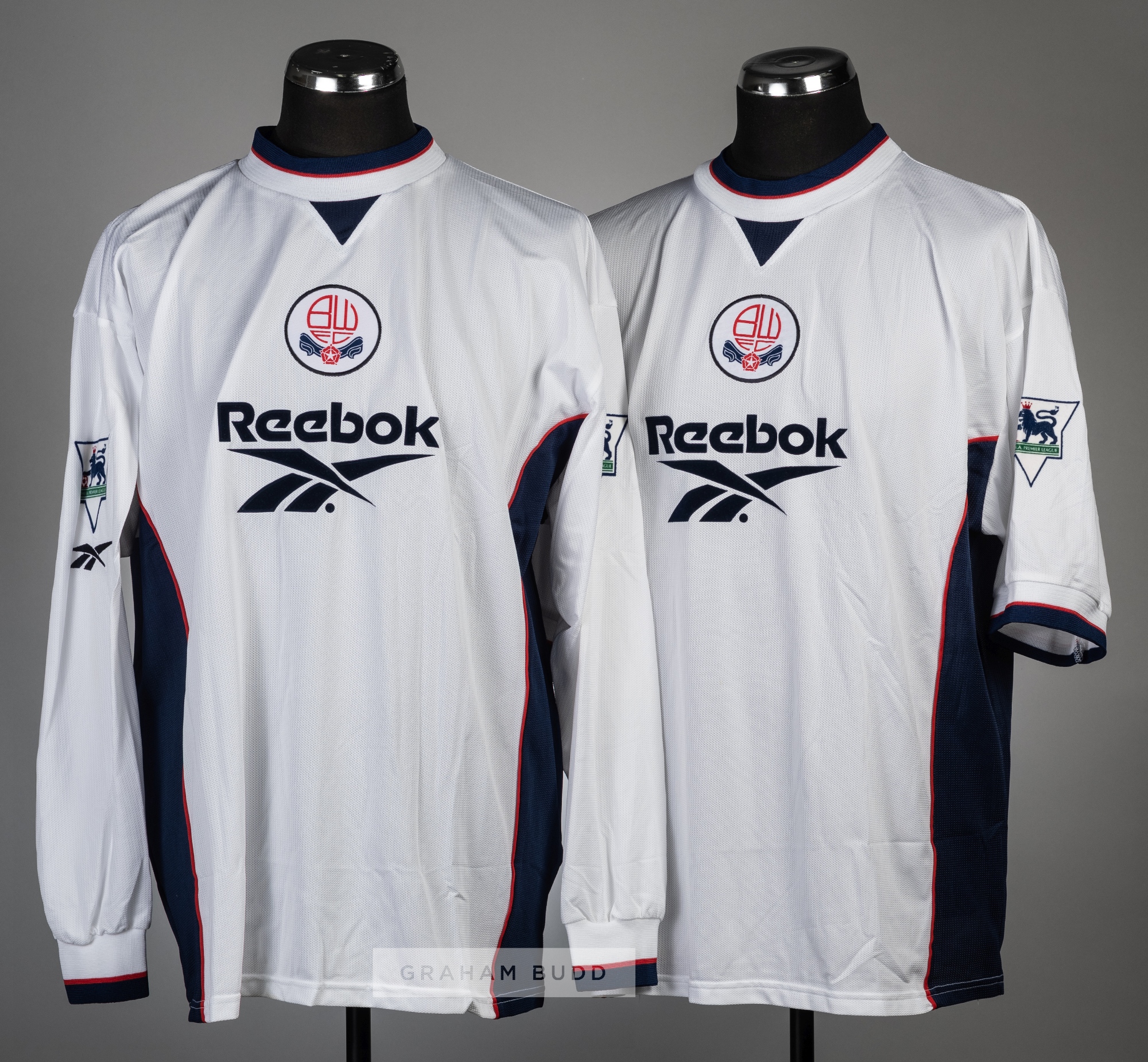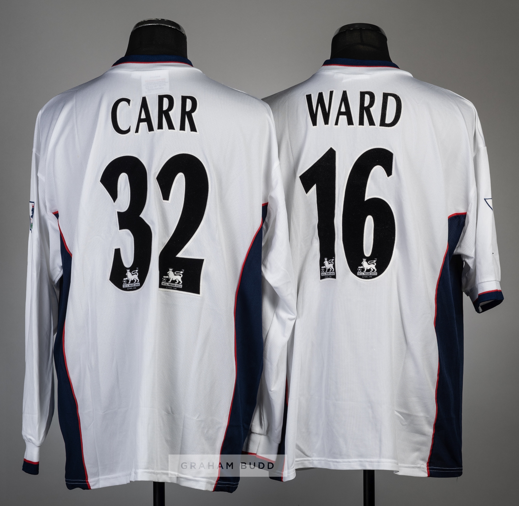 Two Bolton Wanderers white home jerseys, season 1997-98, comprising Gavin Ward no.16 short sleeved and Franz Carr no.32 long-sleeved, each Reebok with Premier League badges, club crests and sponsor logo and player lettering to reverse, (2).